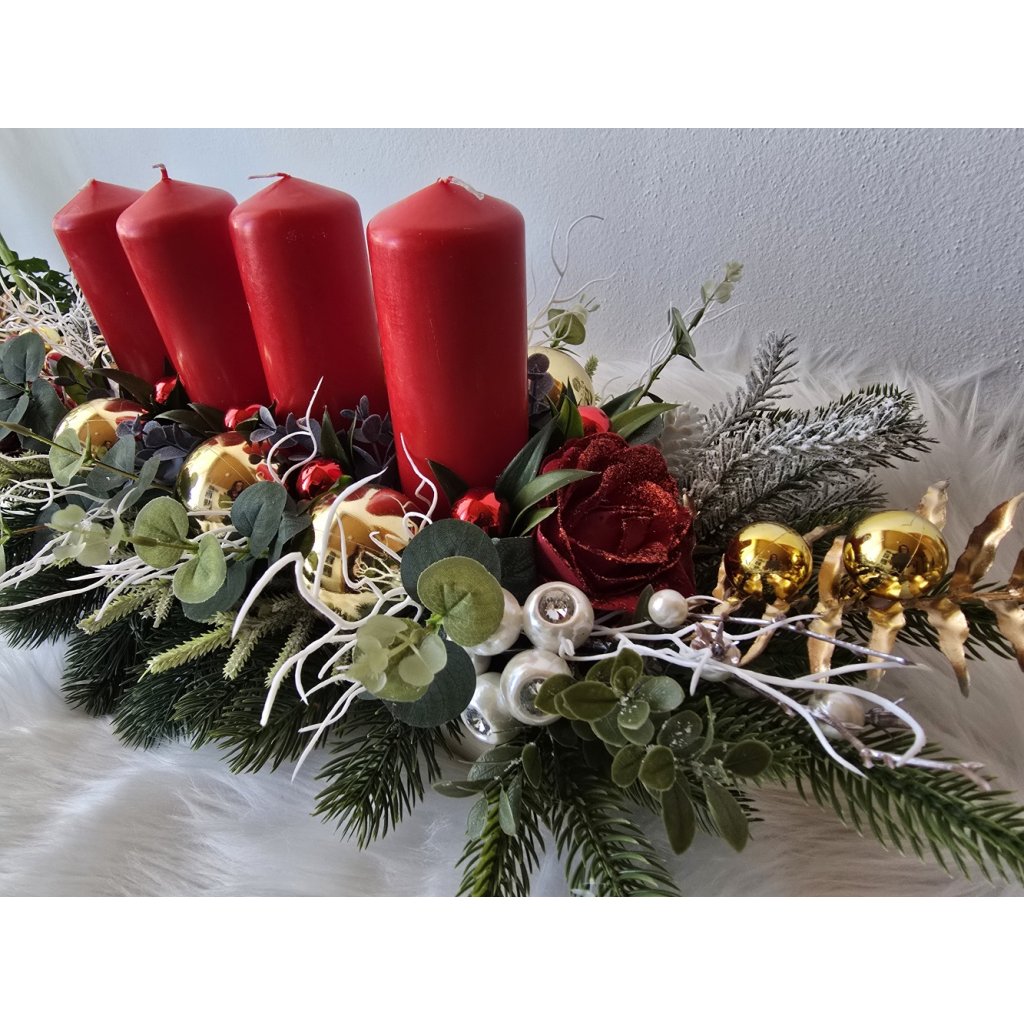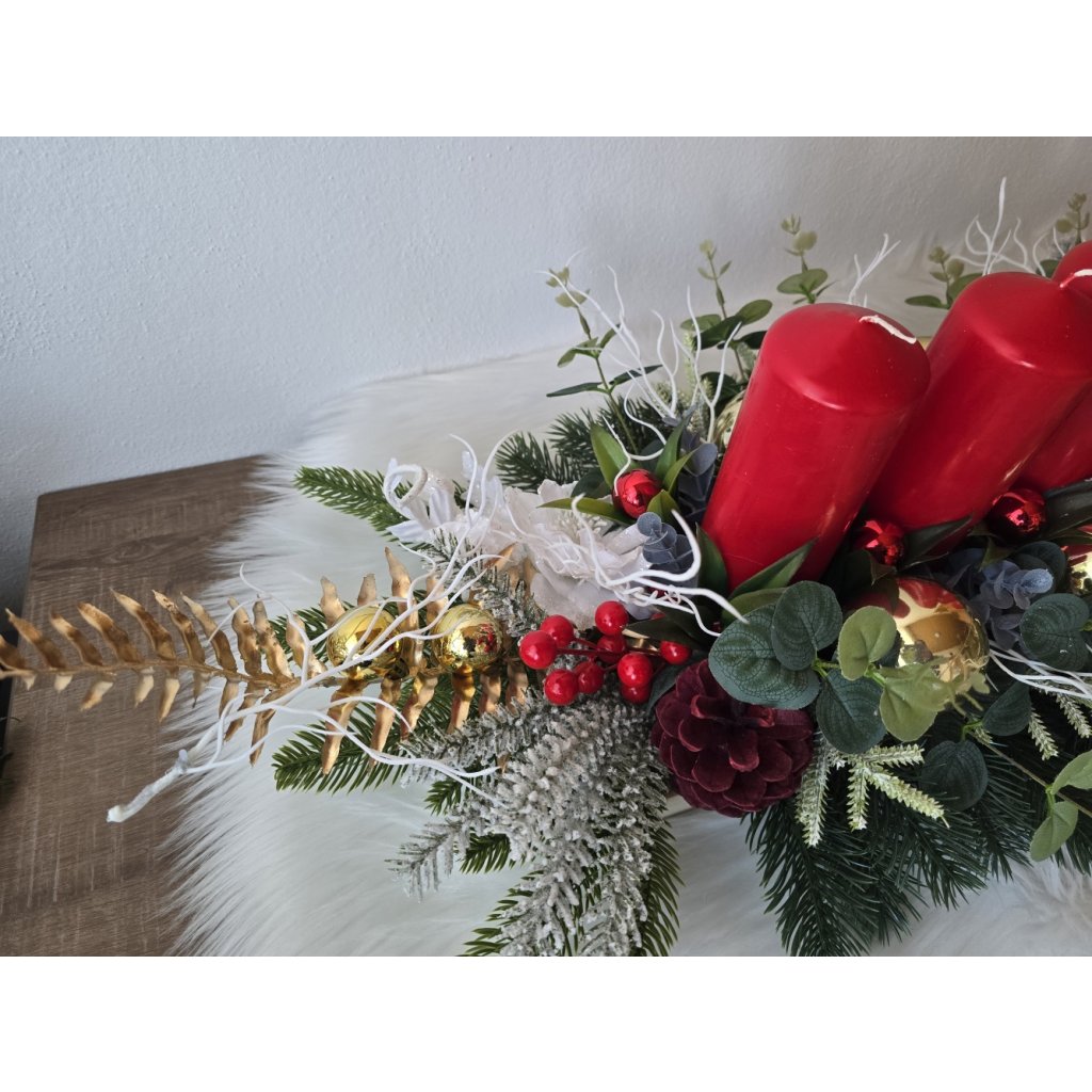 Luxusní adventní dekorace ve výrazné červeno-zlaté kombinaci přinese do vašeho domova tu pravou vánoční atmosféru. Čtyři sytě červené svíce jsou usazeny uprostřed bohaté aranže z jehličí, eukalyptu, zasněžených větviček a zlatých přízdob. Dekor doplňují lesklé baňky, bobule, bílé větvičky a jemné květinové prvky, které dodávají celku slavnostní vzhled.