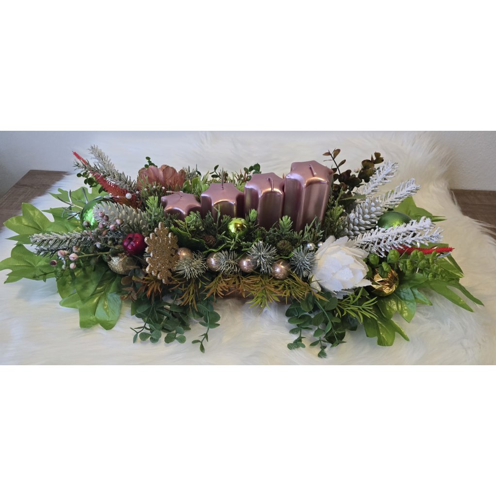 Elegantní adventní svícen v nádherných růžových, zelených a zlatých tónech přináší do vašeho domova kouzelnou vánoční atmosféru. Čtyři luxusní růžové svíce ve tvaru hvězdy doplňuje bohatá zimní zeleň, zasněžené větvičky, perličky, zlaté detaily, dekorativní kouličky a květinové akcenty.