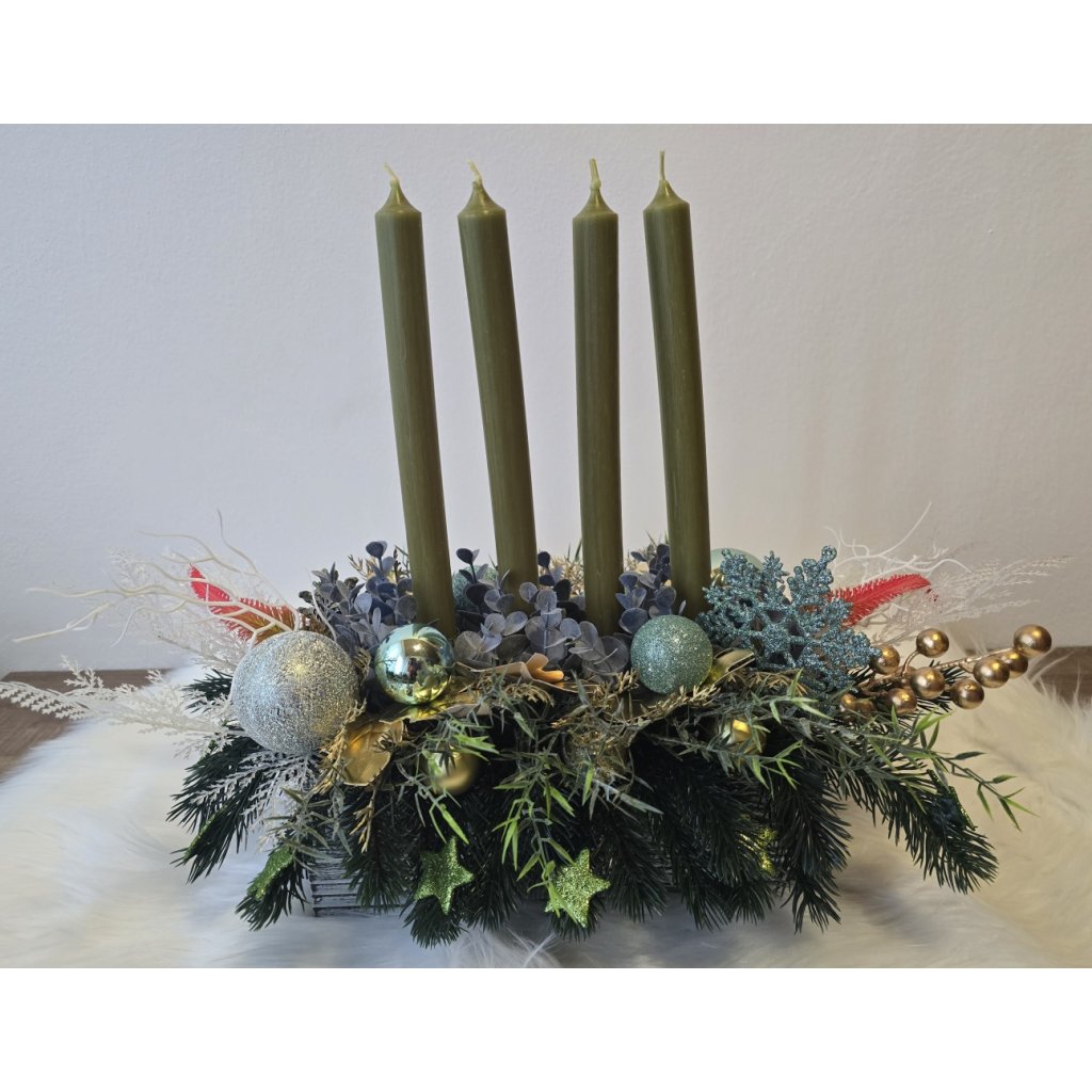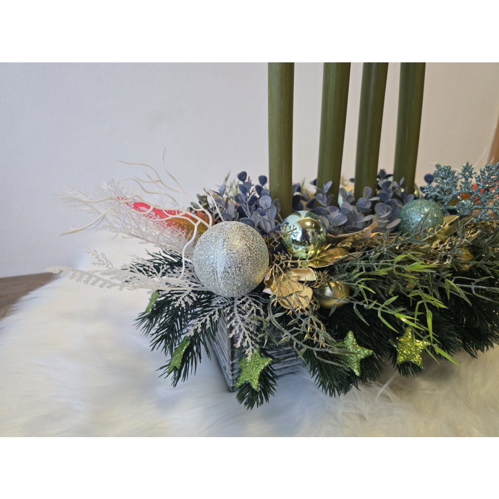 Stylový adventní svícen v elegantních zeleno-zlatých a stříbrných tónech dokonale doladí vánoční atmosféru vašeho domova. Základ tvoří hutná zimní zeleň doplněná o vánoční kouličky, třpytivé hvězdičky, sněhové vločky, zlaté bobule a jemné dekorační větvičky.