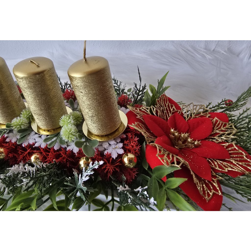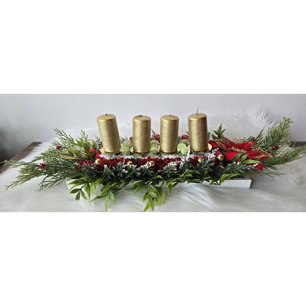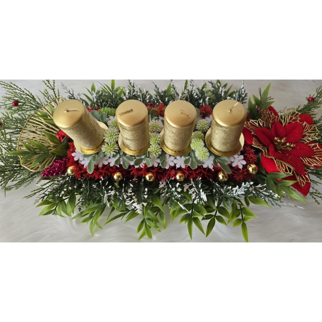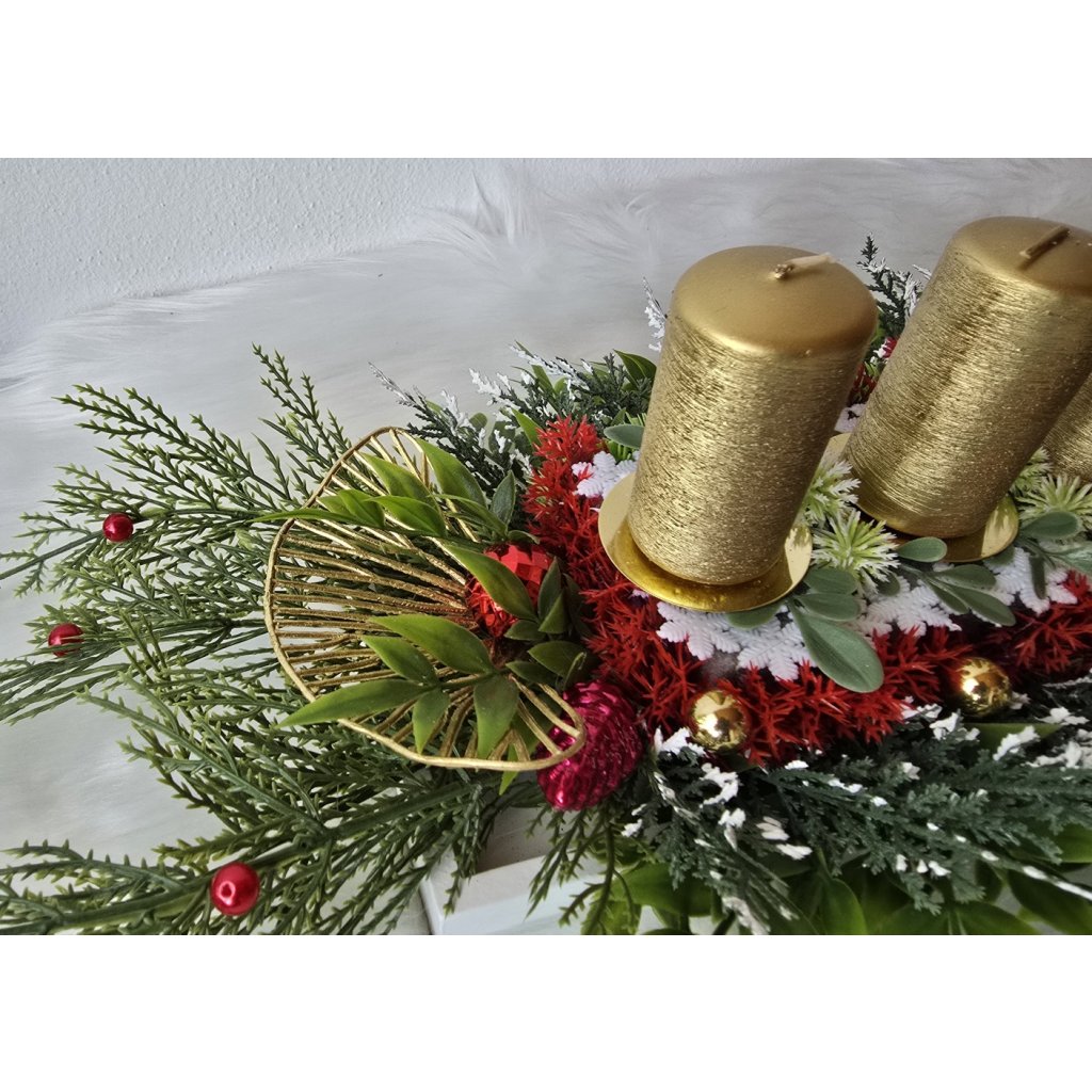 Luxusní adventní svícen v tradičních vánočních barvách – červené, zelené a zlaté. Čtyři zlaté svíčky doplňuje bohatá dekorace z jehličí, květů, mašlí a ozdob. Krásná ruční práce, která vnese do vašeho domova teplo a sváteční atmosféru. Ideální na stůl i jako dárek.