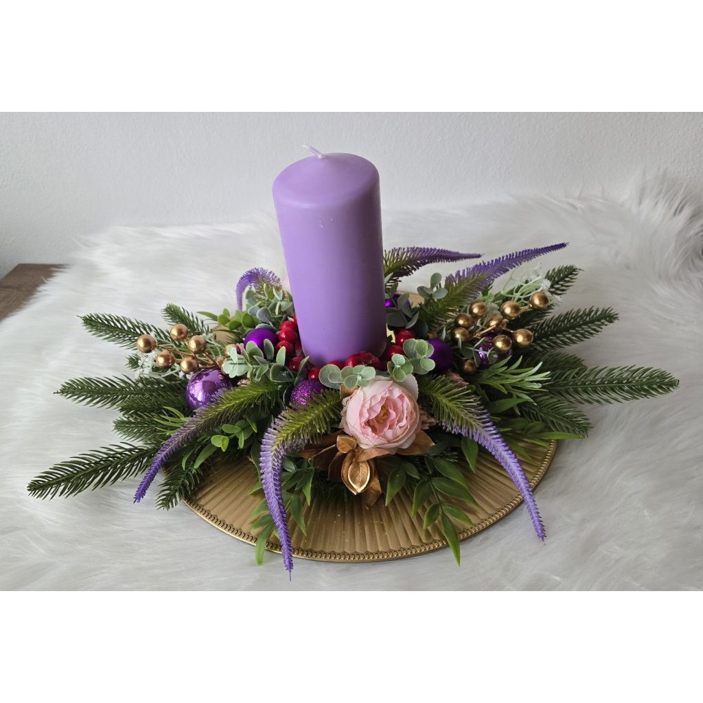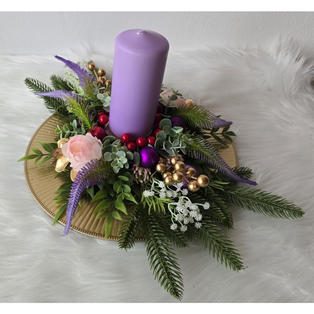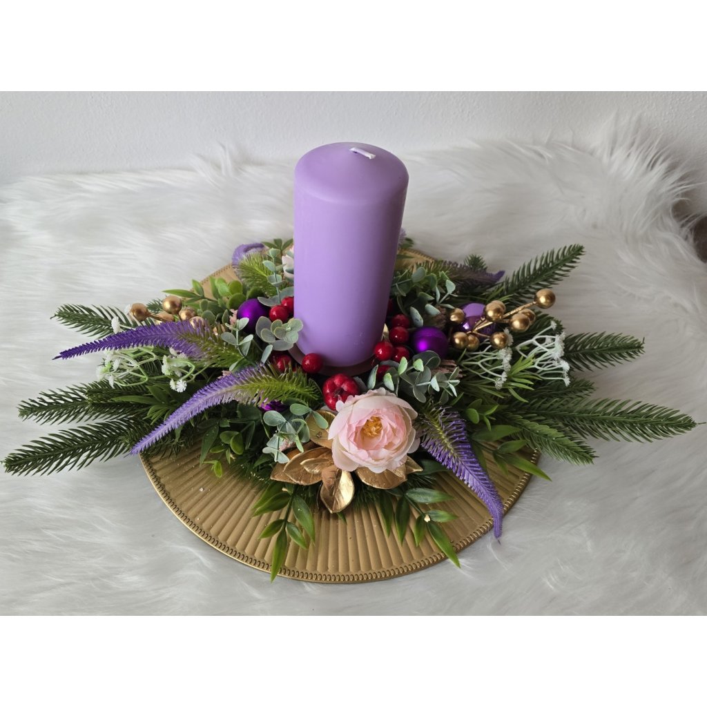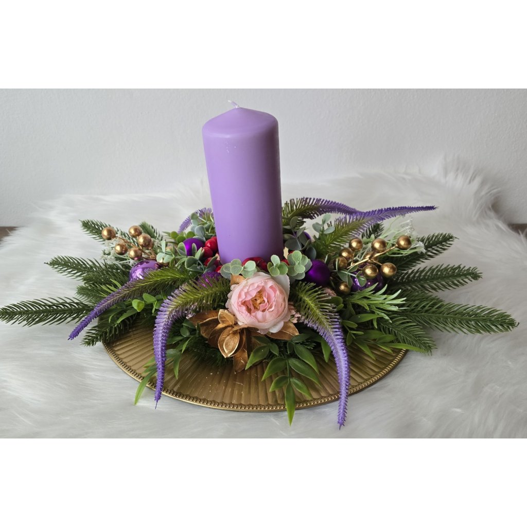Elegantní adventní svícen laděný do levandulových a zlatých tónů se stane originální ozdobou vašeho vánočního interiéru. Dominantou je vysoká fialová svíčka umístěná na zlatém talíři, obklopená bohatou směsí jehličí, zeleně a dekorativních prvků. Kombinace fialových ozdob, zlatých bobulí, růžové květiny a jemných doplňků vytváří harmonickou, jemnou a zároveň luxusní atmosféru. Perfektní dekorace na stůl, komodu nebo jako adventní svícen.