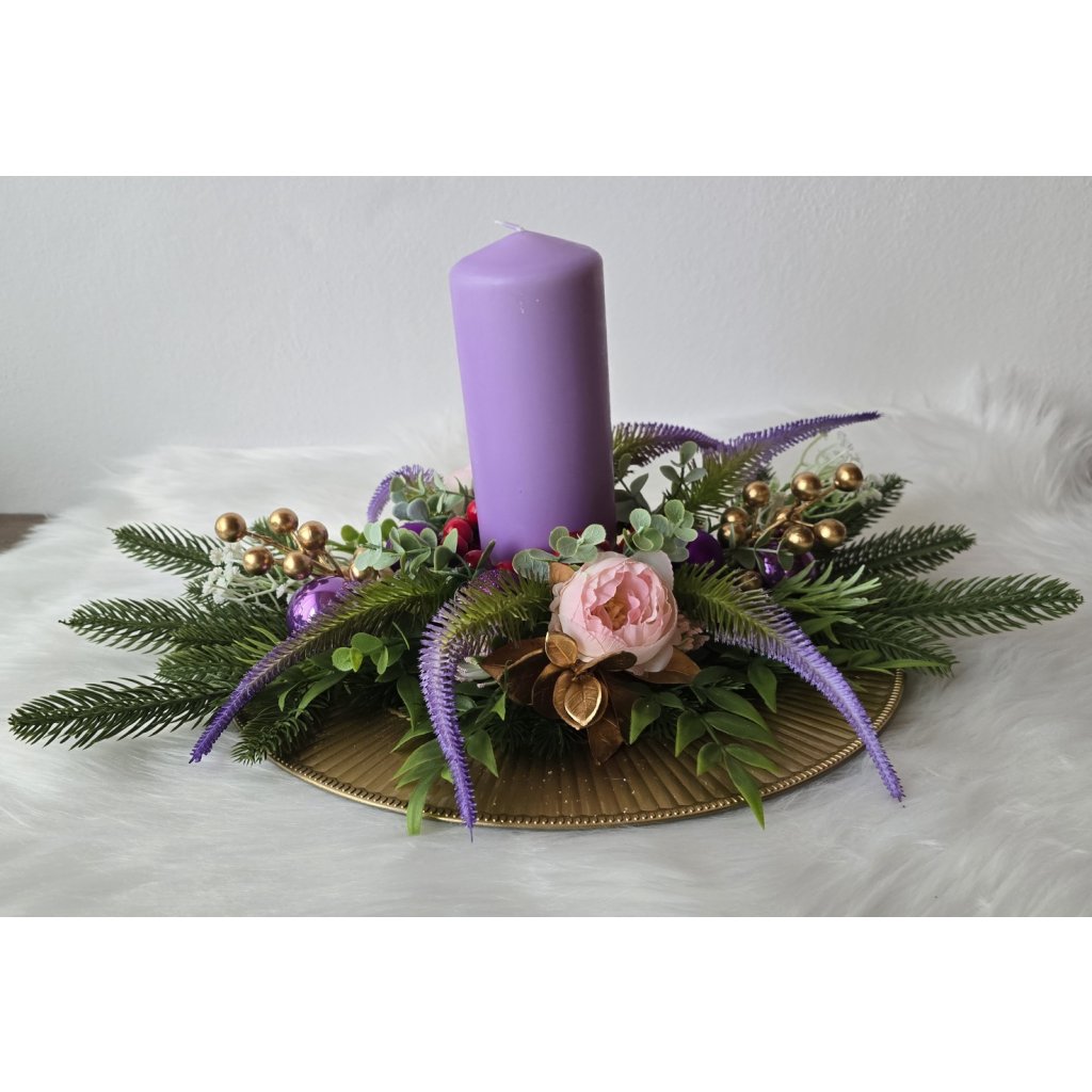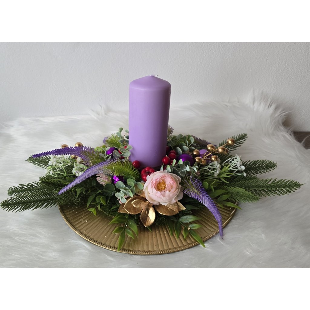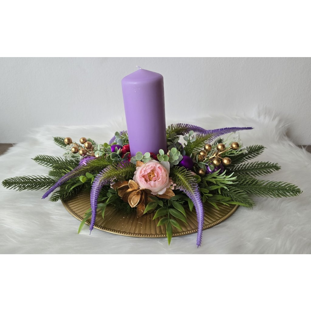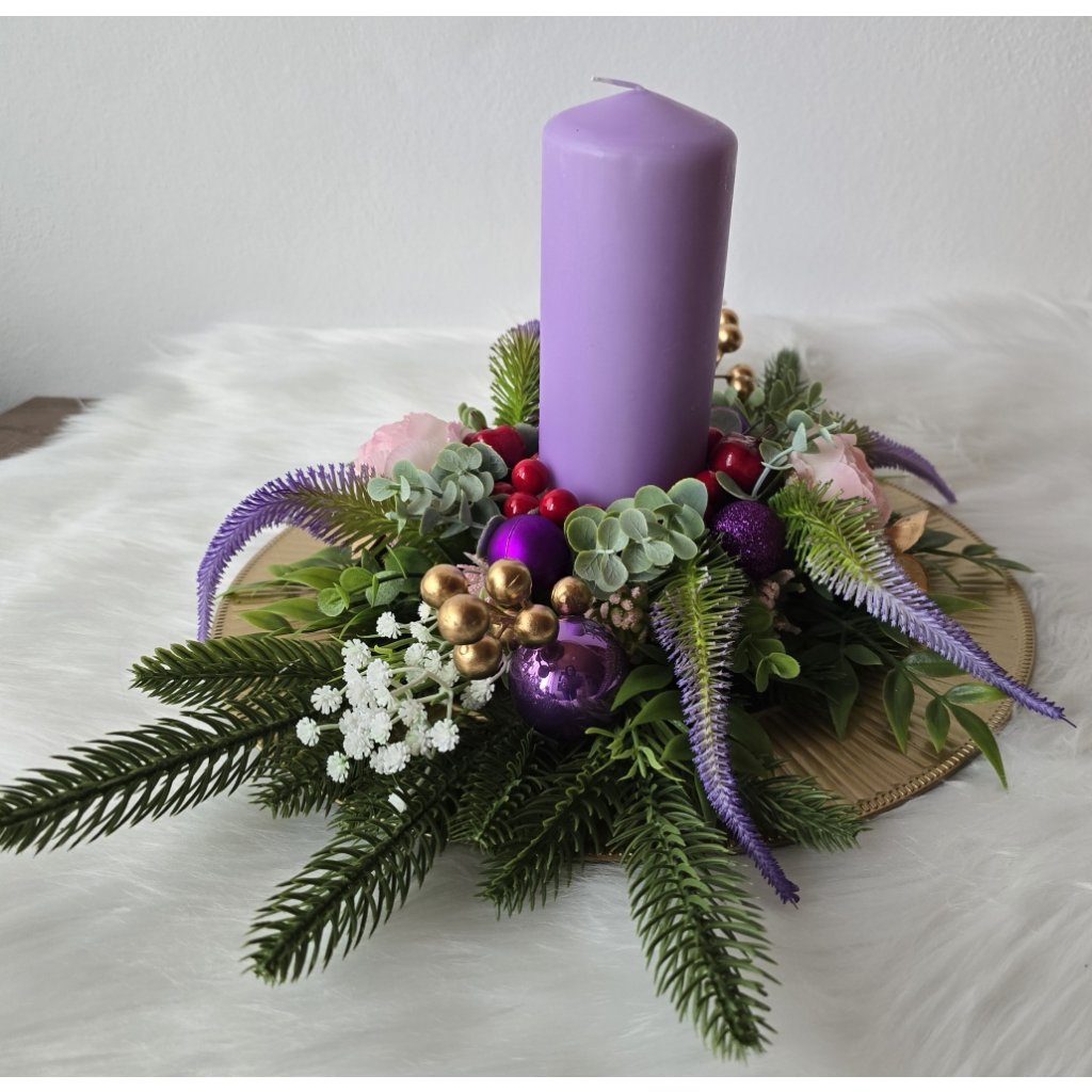Elegantní adventní svícen laděný do levandulových a zlatých tónů se stane originální ozdobou vašeho vánočního interiéru. Dominantou je vysoká fialová svíčka umístěná na zlatém talíři, obklopená bohatou směsí jehličí, zeleně a dekorativních prvků. Kombinace fialových ozdob, zlatých bobulí, růžové květiny a jemných doplňků vytváří harmonickou, jemnou a zároveň luxusní atmosféru. Perfektní dekorace na stůl, komodu nebo jako adventní svícen.