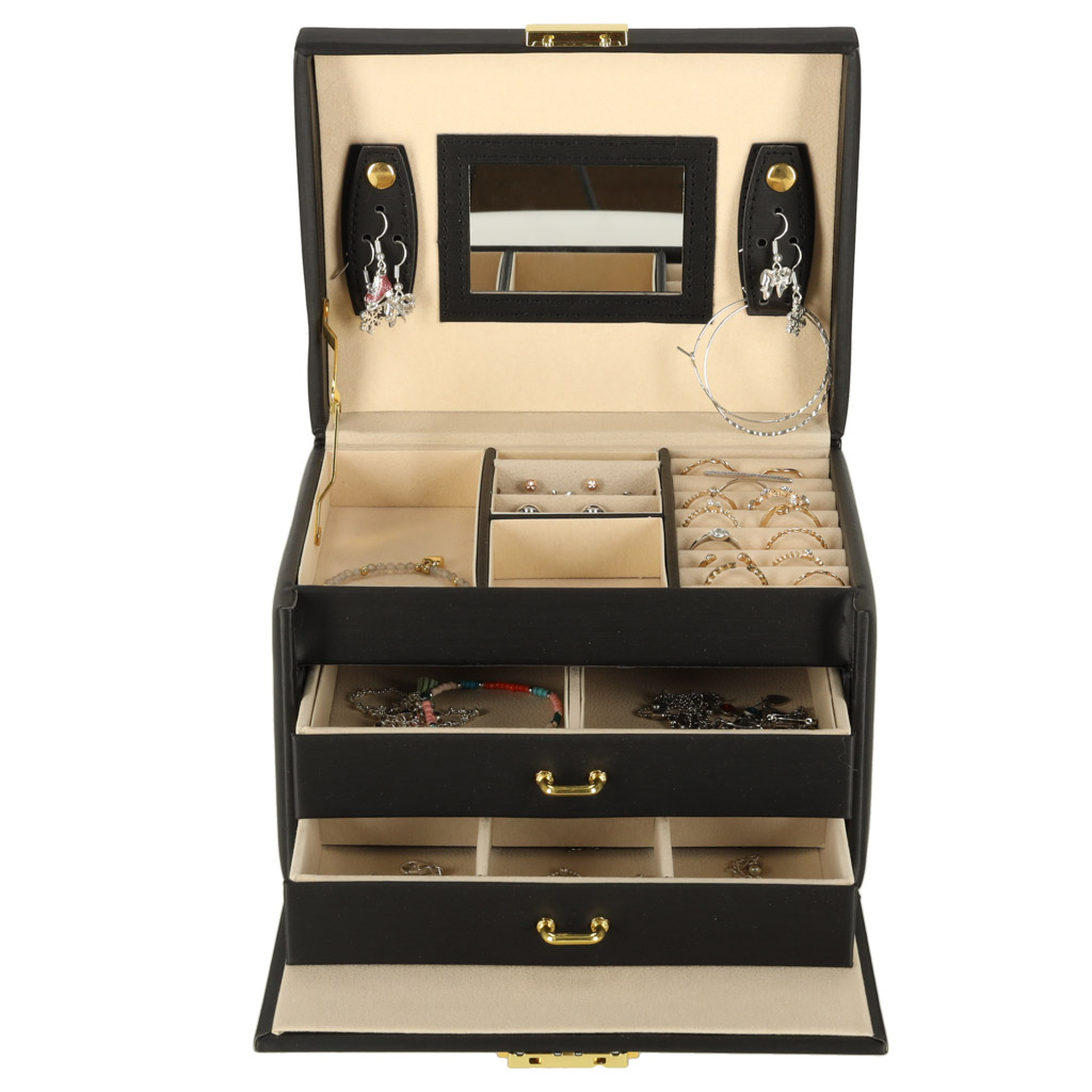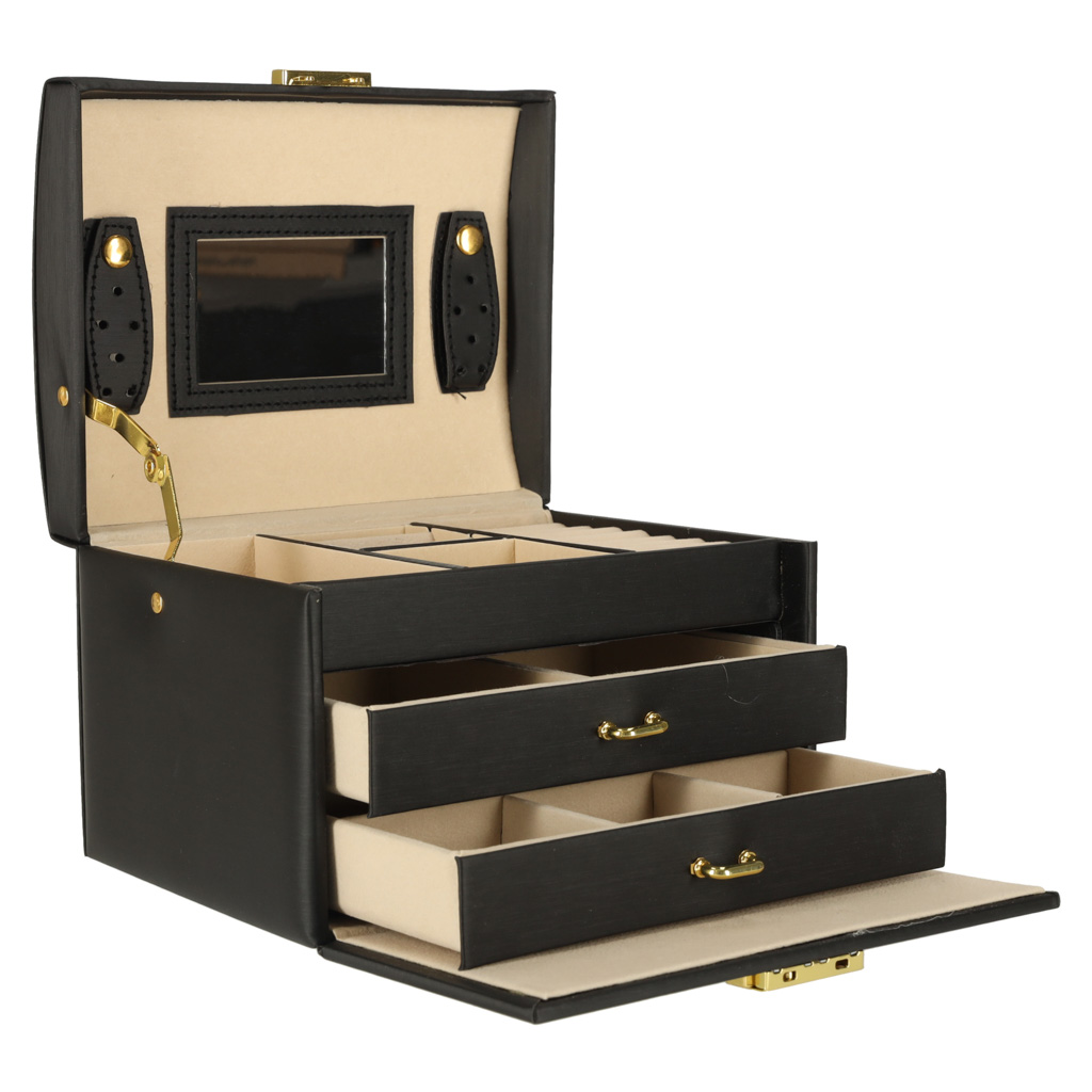• Bezpečné a organizované úložiště – speciálně navržené přihrádky na prsteny, korálky a přívěsky zajišťují dokonalou organizaci celé sbírky, zatímco zámek s klíčem navíc chrání šperky před neoprávněným přístupem.