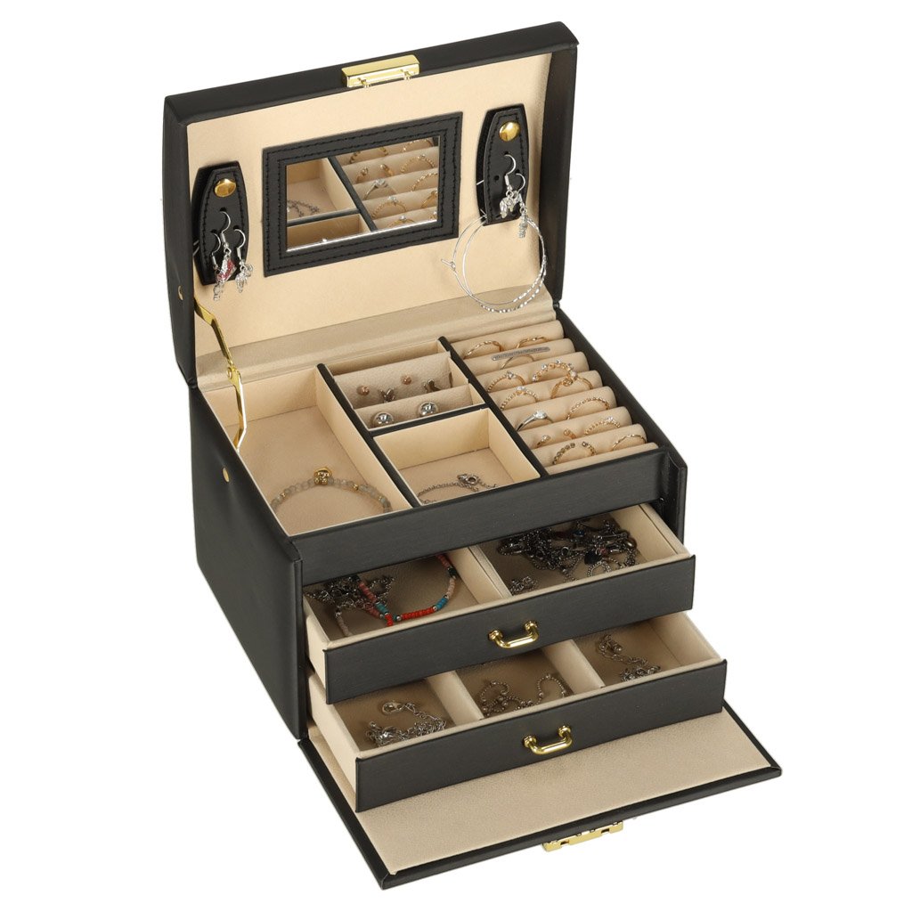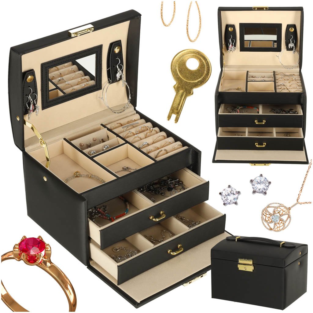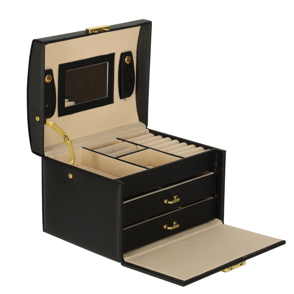 Černá šperkovnice se zásuvkami a zrcátkem – elegantní úložný box na šperky kik