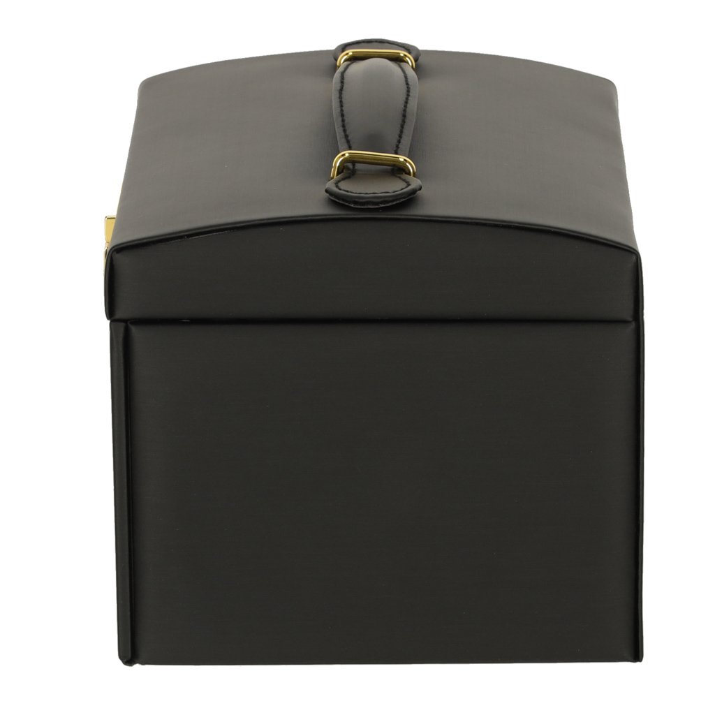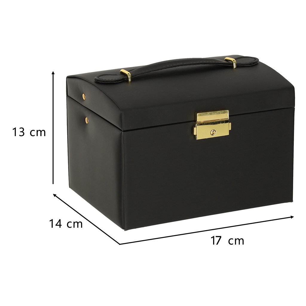 Elegantní černá šperkovnice se zásuvkami je ideálním řešením pro přehledné a stylové uložení vašich šperků. Uvnitř nabízí dostatek prostoru pro prsteny, náušnice, řetízky i náramky, přičemž jednotlivé přihrádky chrání vaše poklady před poškozením. Součástí je i praktické zrcátko a uzamykatelný zámek pro bezpečné uložení. Luxusní design s jemnými zlatými doplňky z ní dělá perfektní dárek i stylový doplněk toaletního stolku.
