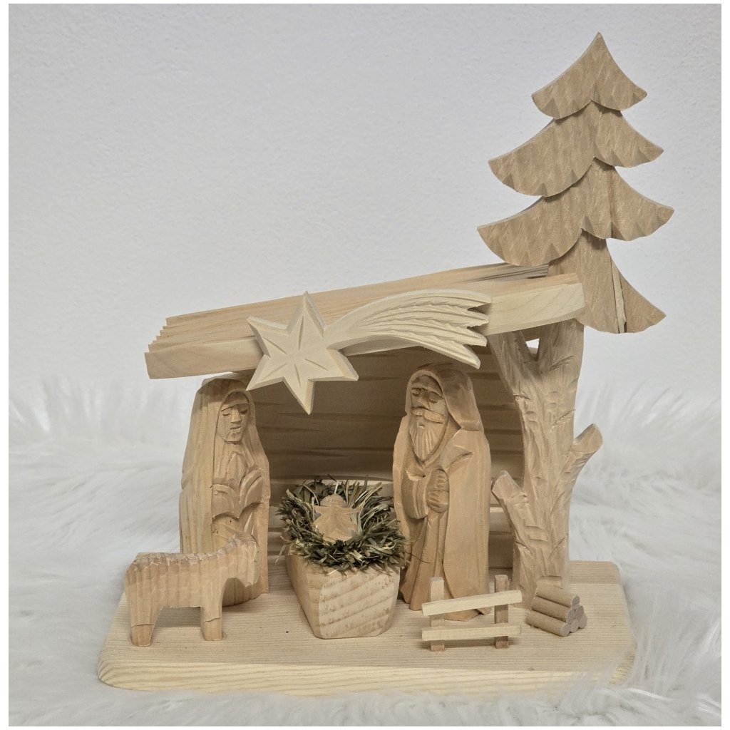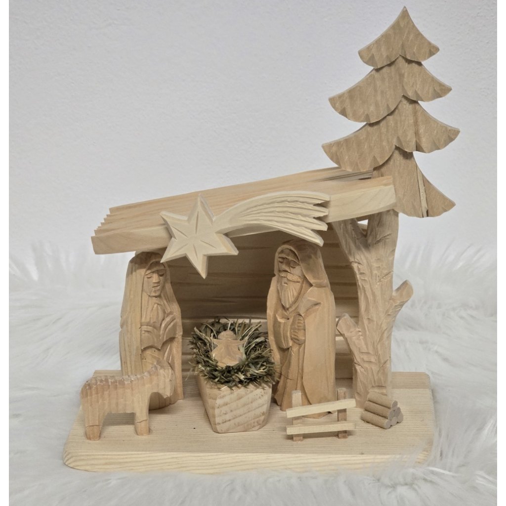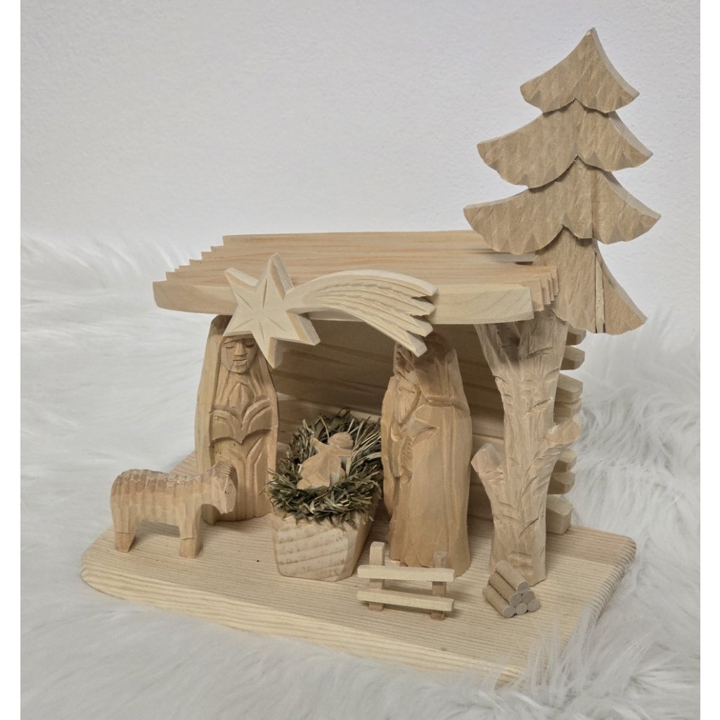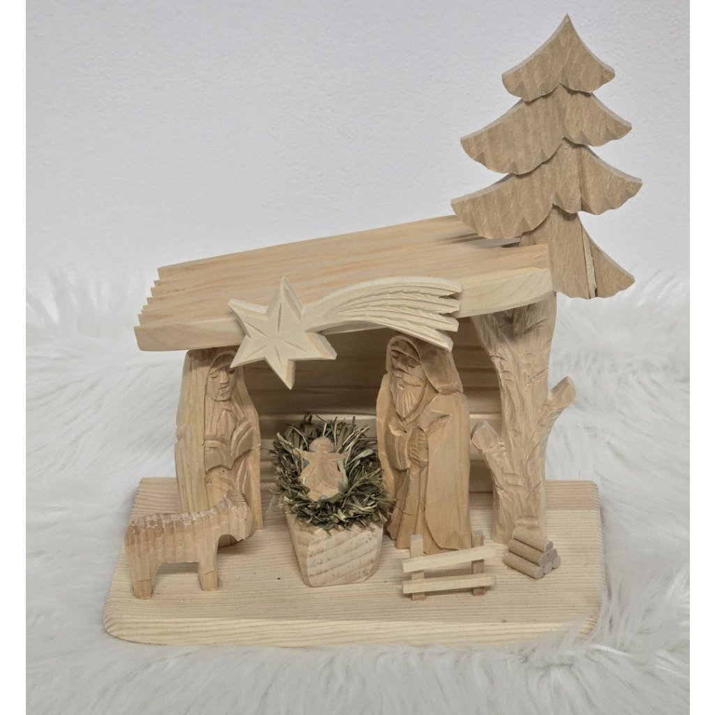 Krásný dřevěný betlém s hvězdou, stromem a ovcí, který znázorňuje Svatou rodinu s Ježíškem v jesličkách. Každý detail je ručně vyřezávaný z přírodního dřeva, což zaručuje originalitu a tradiční vzhled. Tento betlém přináší do vašeho domova pocit klidu, víry a vánoční pohody. Ideální dekorace na stůl, polici či pod vánoční stromek.
