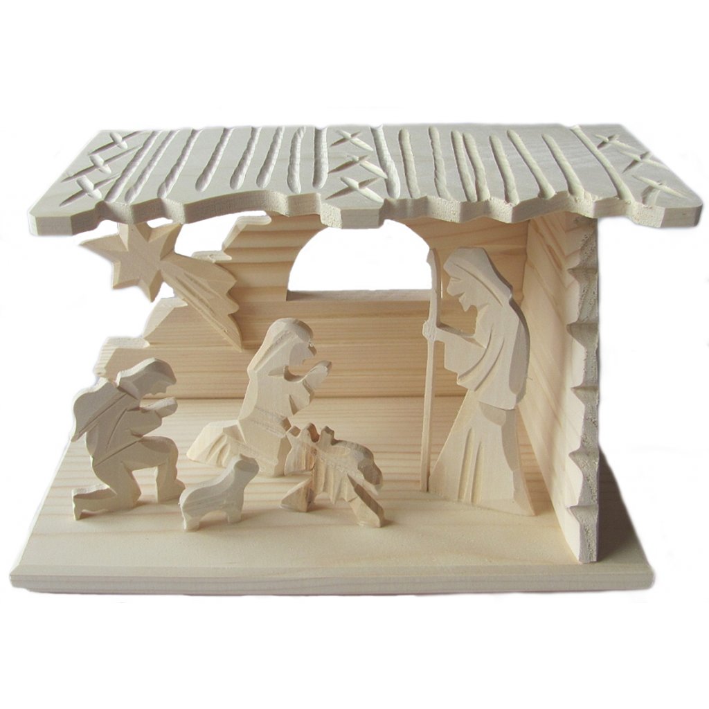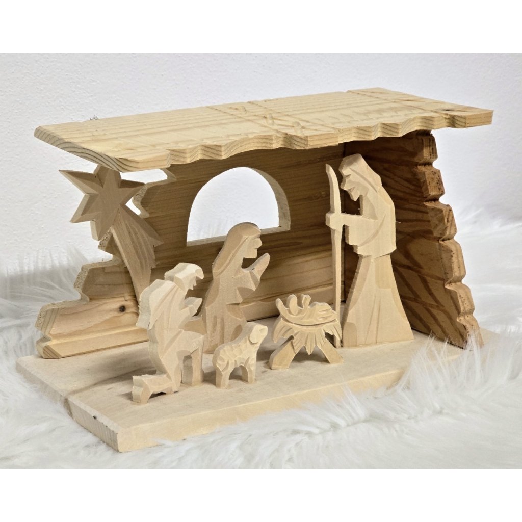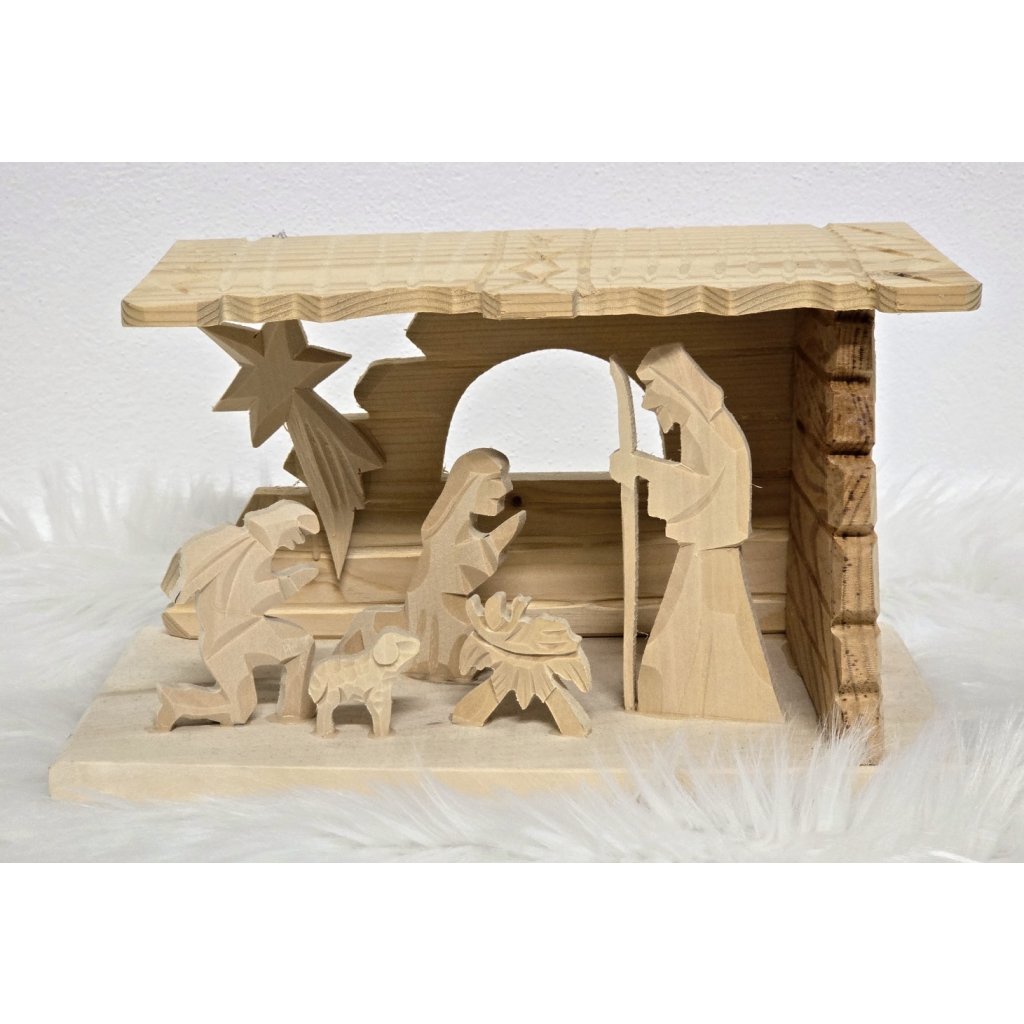 Pěkný dřevěný betlém, ručně vyřezávaný. Materiál betlému masivní dřevo lípa v kombinaci z jehličnatým dřevem. Figurky u betlému jsou ručně vyřezaný též z lipového dřeva. Rozměr dřevěného betlému vxhxš 15 x 17 x 27 cm. Doprava po cele ČR.