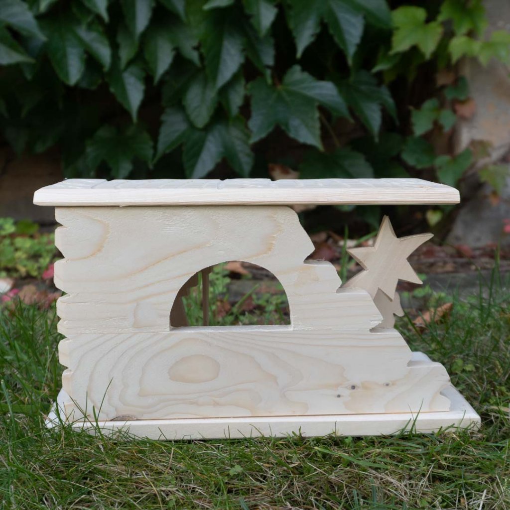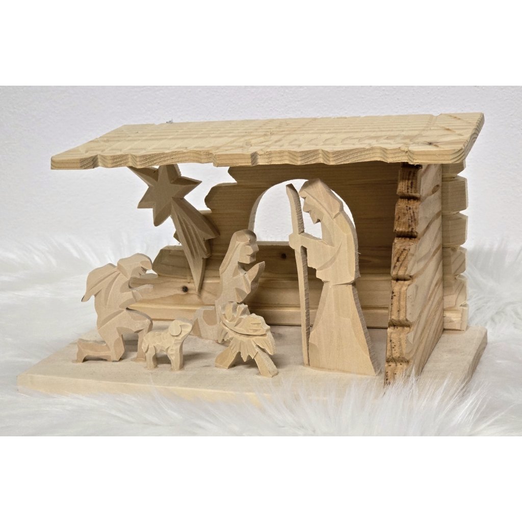 Dřevěný betlém s keramickou Svatou rodinou – ruční výroba