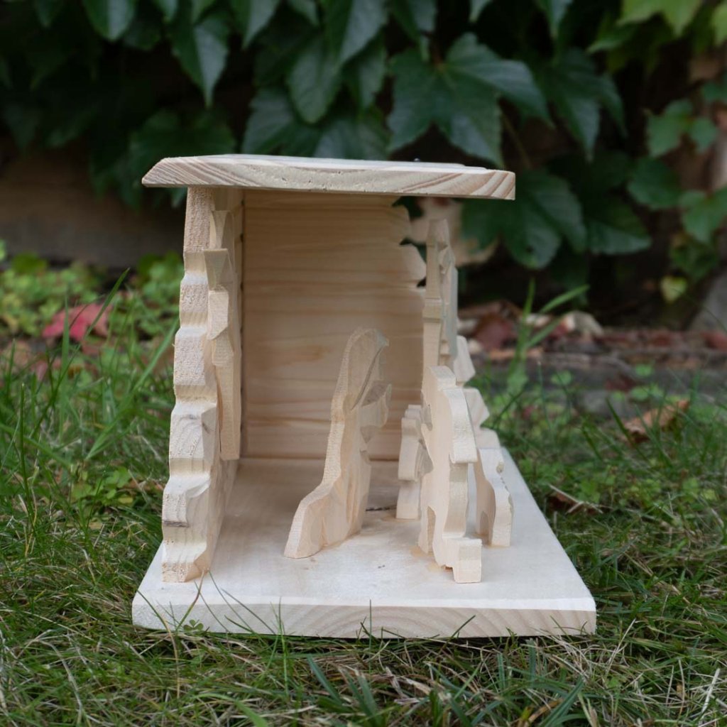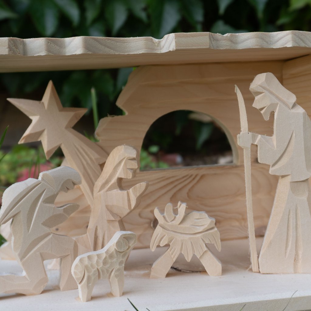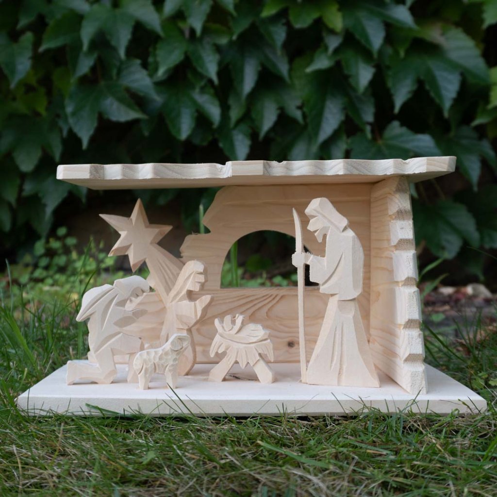 Dřevěný betlém s vyřezávanými postavami – vánoční dekorace