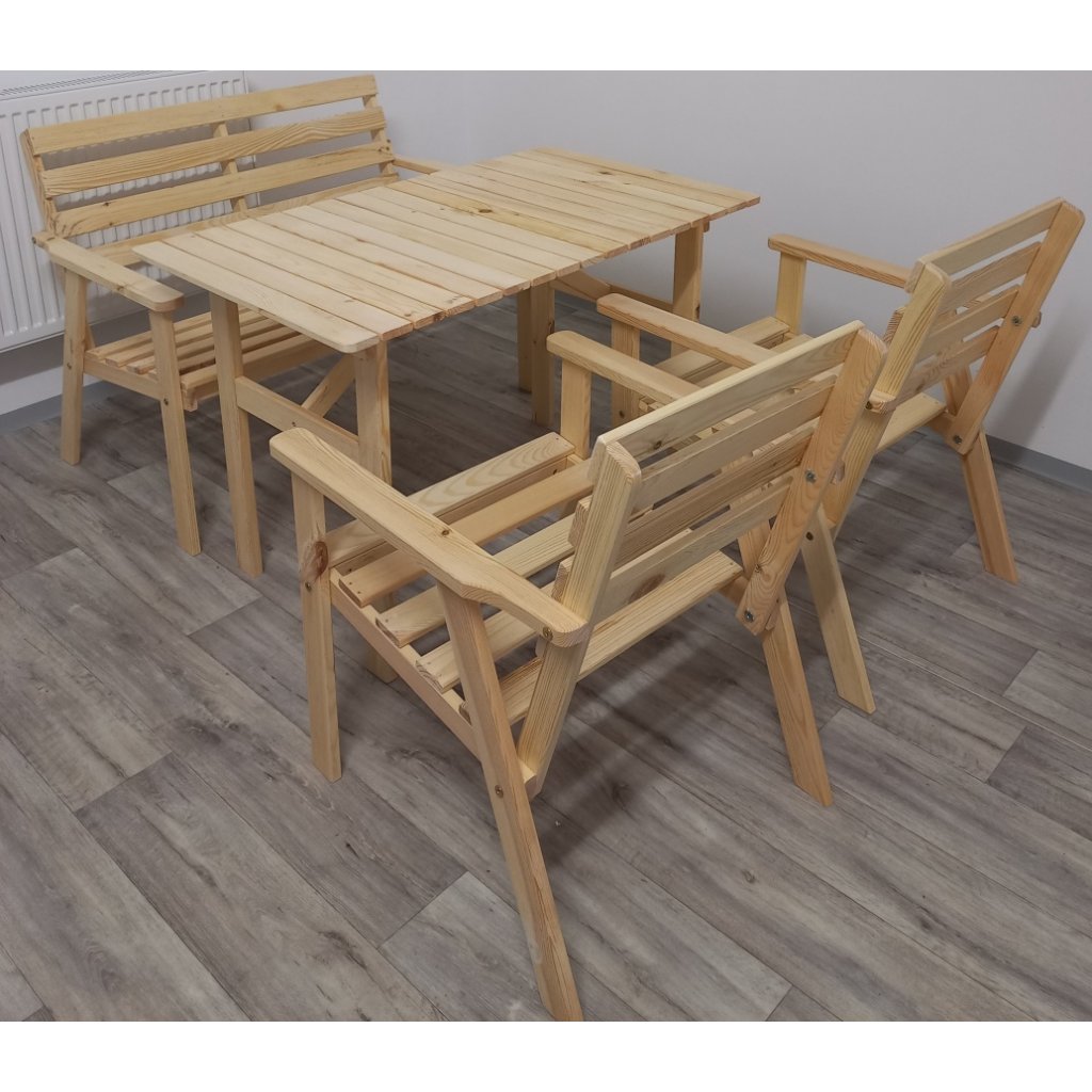 Zahradní komplet Aster trim 2+1+1. Set se skládá ze dvou křesel, jednoho stolu a jedné lavice. Rozměry stolu: 120x70x70 cm, lavice 114x68x38/83 cm, kresla 64x68x38/83 cm. Povrchová úprava bez povrchové úpravy.