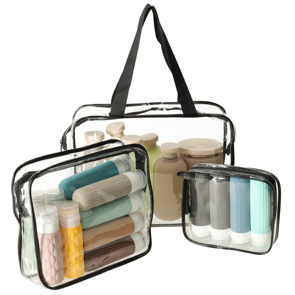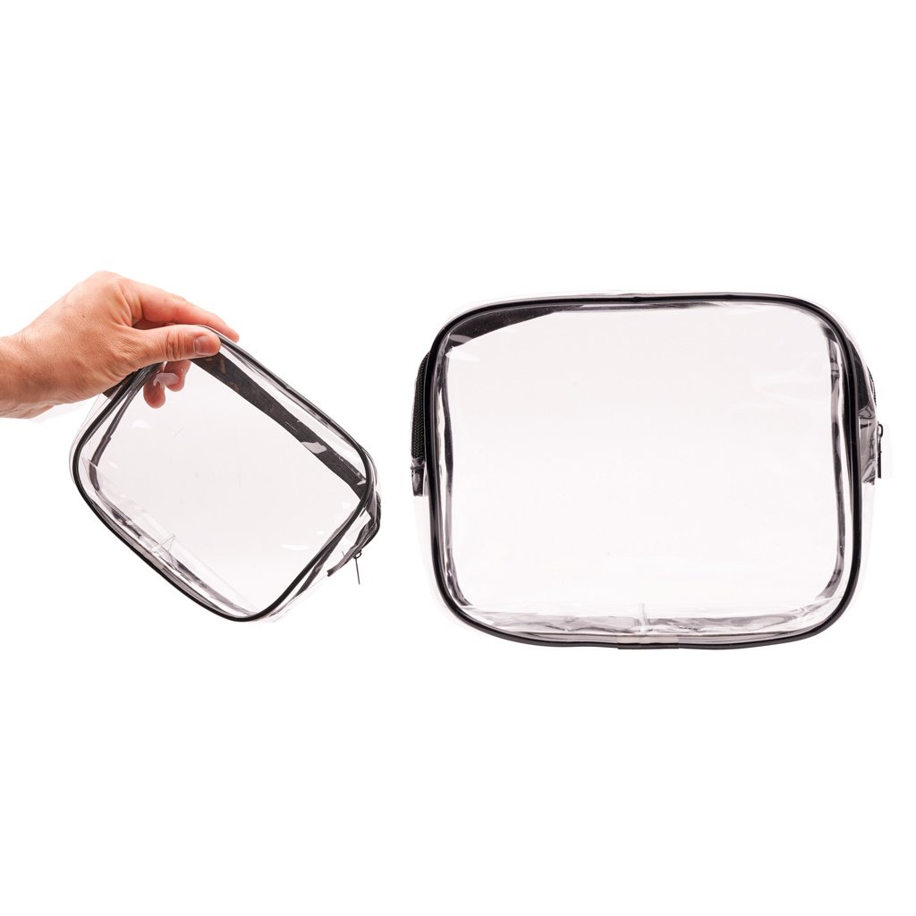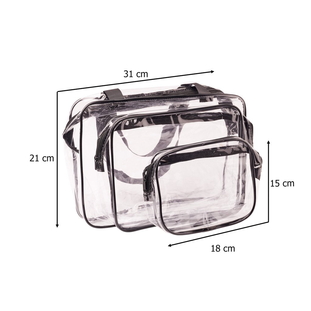 Praktická sada tří průhledných kosmetických taštiček je ideální pro cestování i každodenní použití. Díky transparentnímu designu snadno najdete potřebné věci, a navíc splňují požadavky pro přepravu tekutin v letadlech. Různé velikosti umožňují efektivní organizaci kosmetiky, hygienických potřeb i drobností. Vyrobeny z odolného, voděodolného PVC, které se snadno čistí.