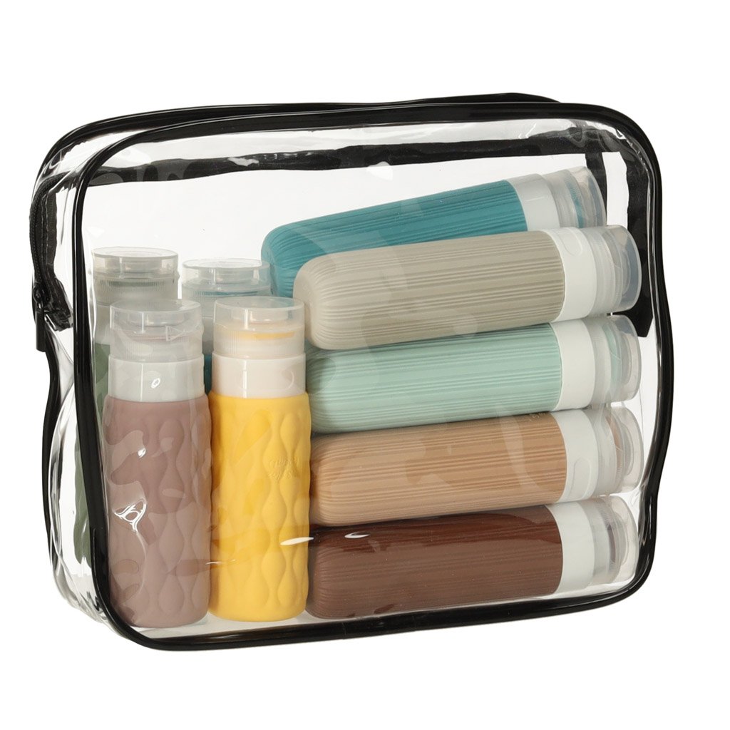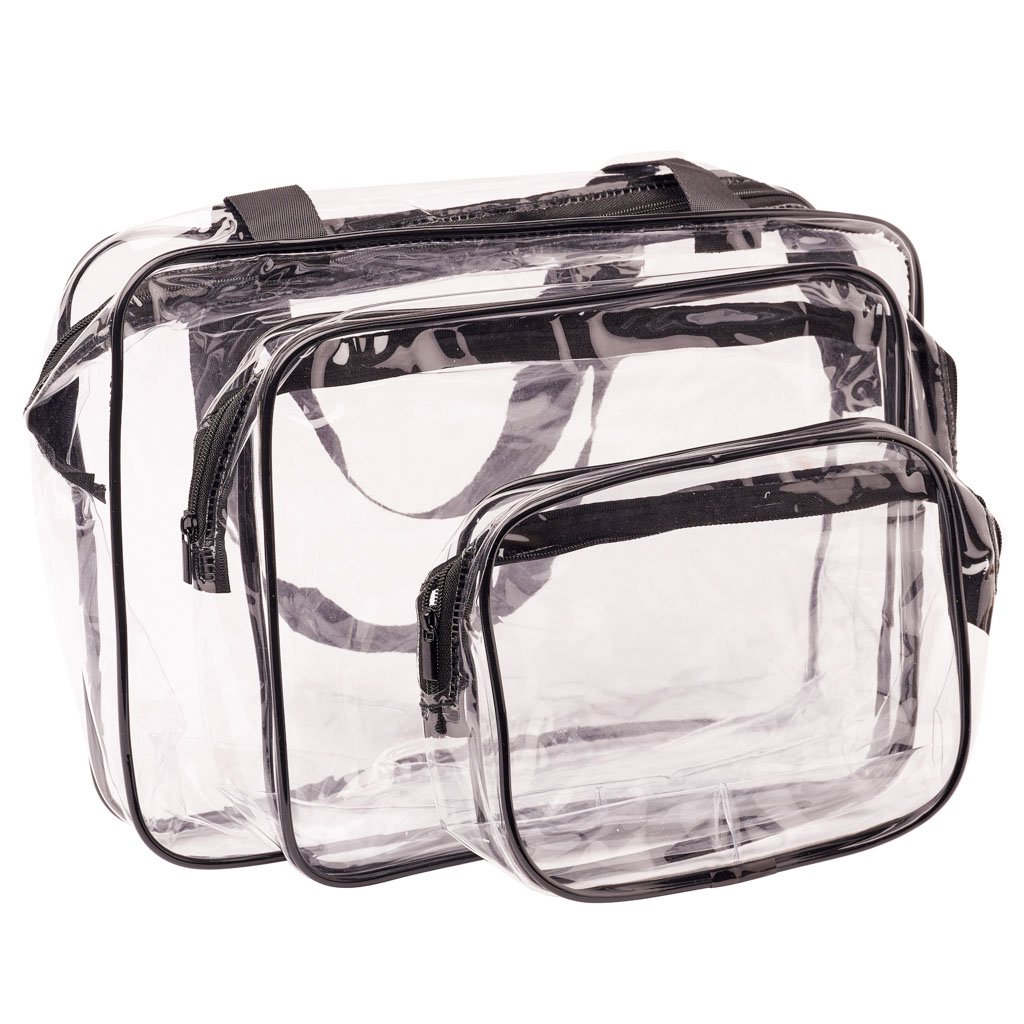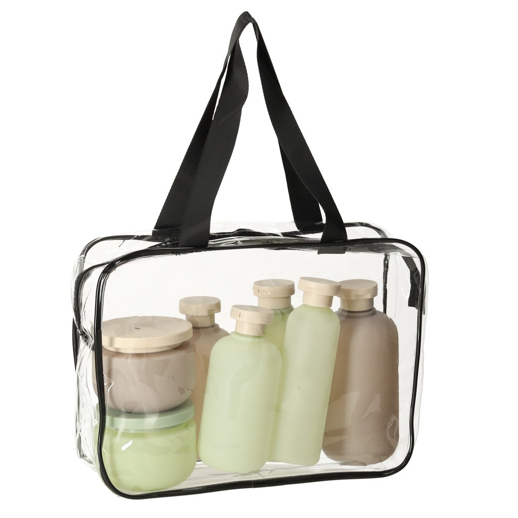 Praktická sada tří průhledných kosmetických taštiček je ideální pro cestování i každodenní použití. Díky transparentnímu designu snadno najdete potřebné věci, a navíc splňují požadavky pro přepravu tekutin v letadlech. Různé velikosti umožňují efektivní organizaci kosmetiky, hygienických potřeb i drobností. Vyrobeny z odolného, voděodolného PVC, které se snadno čistí.