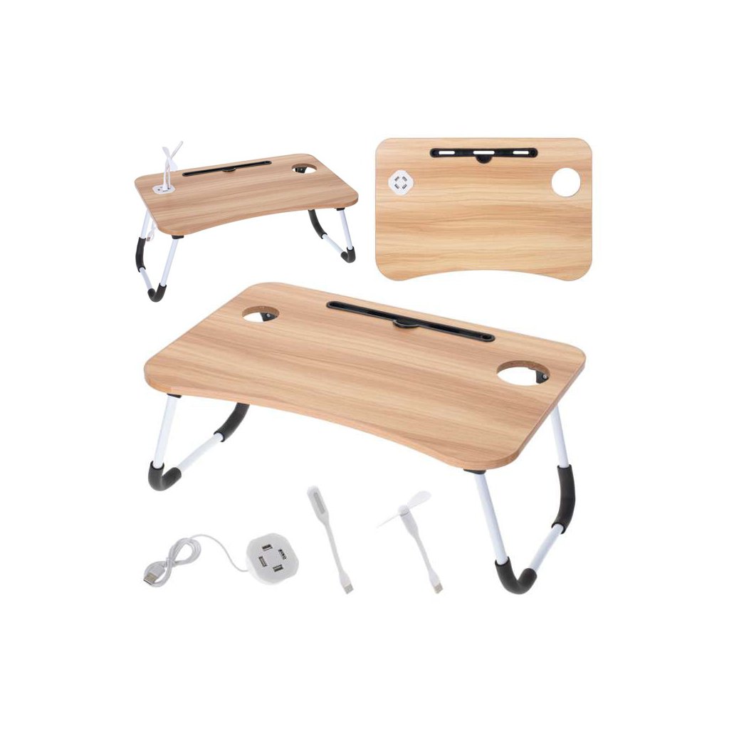 Praktický skládací stolek na notebook s vestavěnými USB porty je ideální pro práci, studium i odpočinek v posteli či na gauči. Díky stabilním sklápěcím nohám a lehké konstrukci je snadno přenosný a rychle připravený k použití. Nabízí držák na tablet, otvor na nápoj a USB lampičku i mini ventilátor. Multifunkční design umožňuje využití také jako snídaňový stolek nebo psací pult pro děti. Povrch z imitace dřeva působí elegantně a hodí se do každého interiéru.