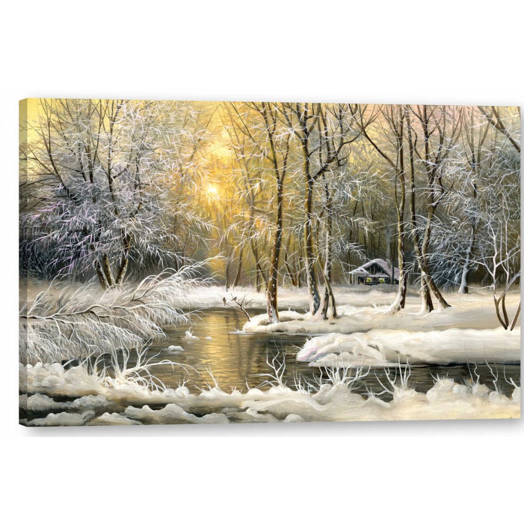 Zimní les - skvělá reprodukce. Obrázky vytištěné na plátně, v poslední době tak populární, mají mnoho výhod. Jedním z nich je cena. Jsou rozhodně levnější než ty, které hodiny maloval malíř. Alternativou k tradiční malbě je reprodukce obrázků . Takový je obraz zimního lesa. Správně vybrané plátno a specializované plotry umožnily dosáhnout nádherného efektu. Díky vysoce kvalitnímu tisku na plátno vypadá reprodukce jako umělecké dílo. Reprodukce obrazu není nic jiného než jeho kopie. Ten z naší nabídky zobrazující obraz lesa, zachoval se v tlumených barvách. Umělec zachycuje bělost sněhu pokrývající vše kolem. Zapadající slunce vrhá poslední paprsky. Teplá barva paprsků prorážejících se zasněženými stromy mírně změkčuje mrazivou krajinu. Zázračně se odráží v pomalu tekoucí řece v popředí. Světlo viditelné v očích chaty kdesi v pozadí vás zve dovnitř. Rozměr obrazu 75x50 cm.