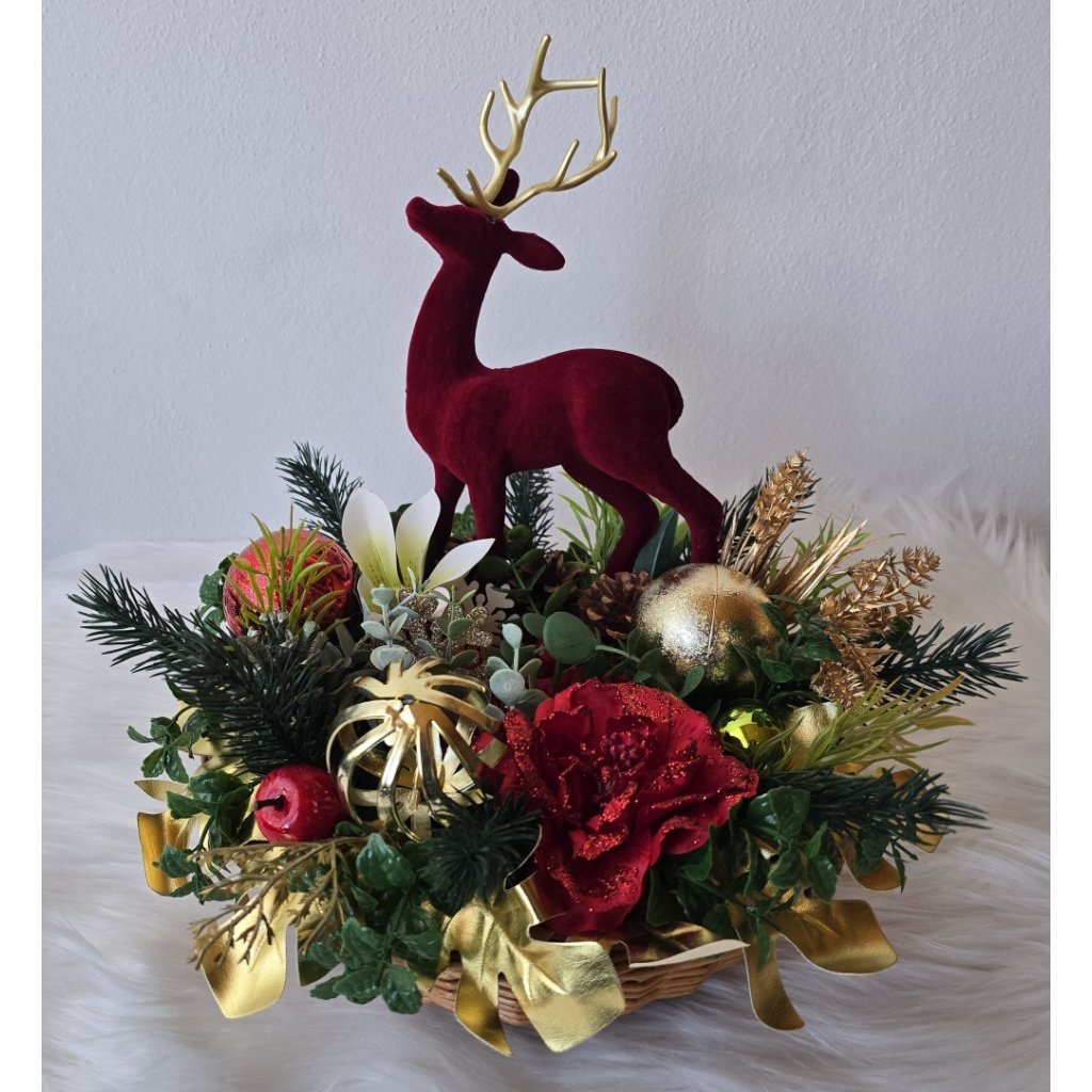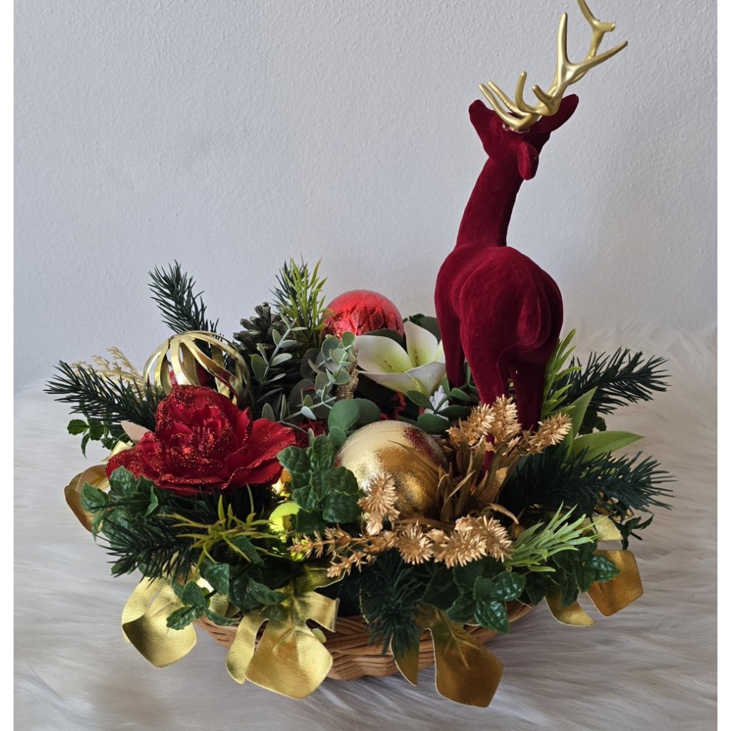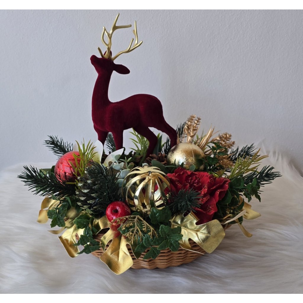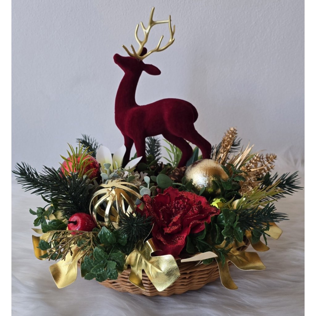 Elegantní vánoční dekorace se sobem v sytě červeném sametu, doplněná zlatými ozdobami, šiškami, umělými květy a větvičkami jehličí. Stylová adventní výzdoba pro sváteční atmosféru vašeho domova. Vhodná na stůl, komodu i jako originální dárek. Kombinace červené, zlaté a zelené barvy navodí pocit tepla a elegance.