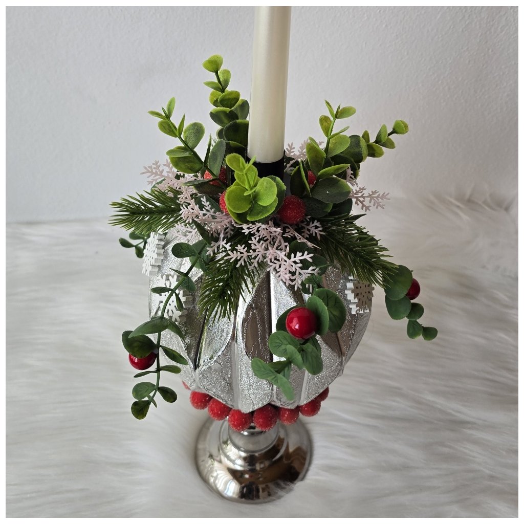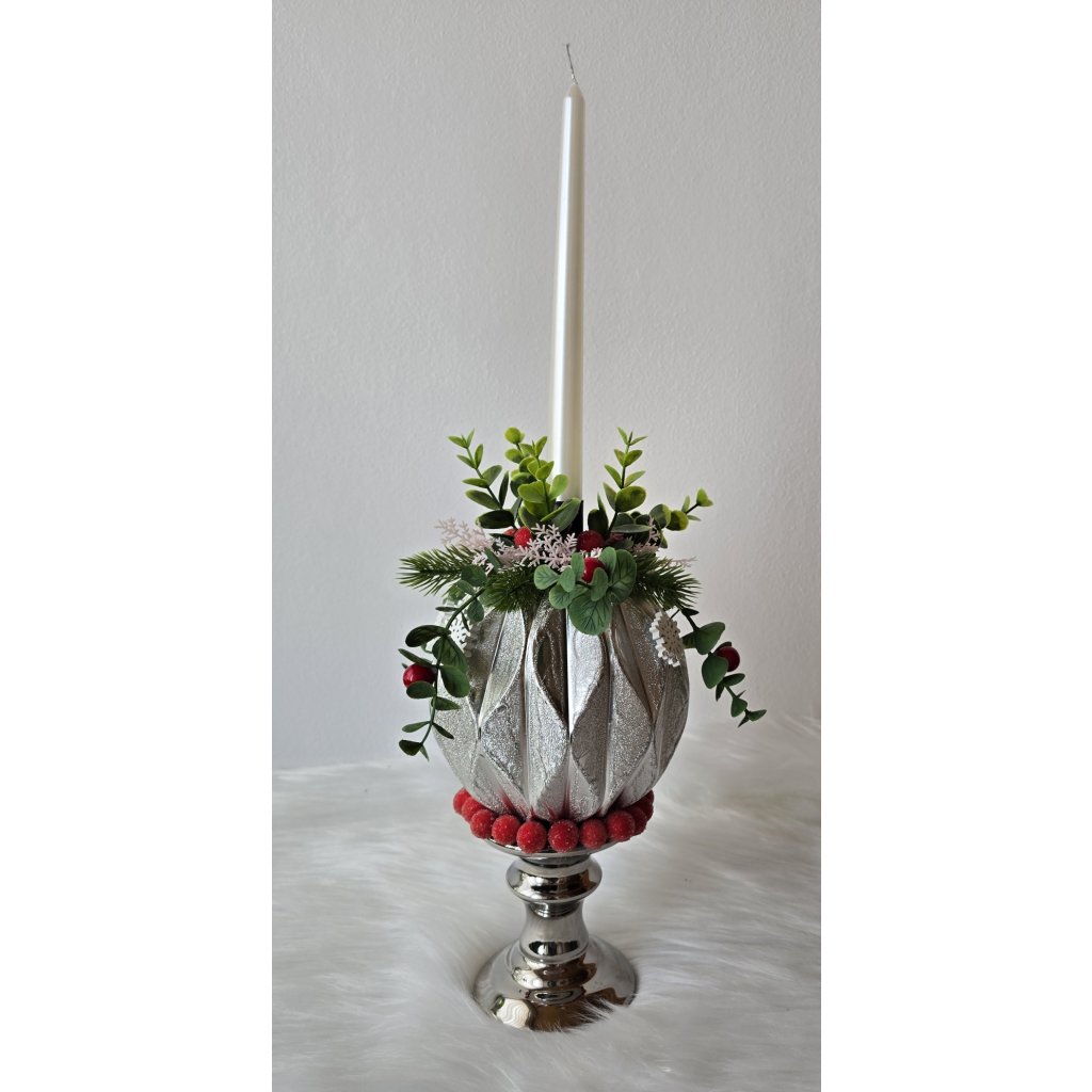 Vánoční svícen stříbrný s vysokou svíčkou a červenými ozdobami