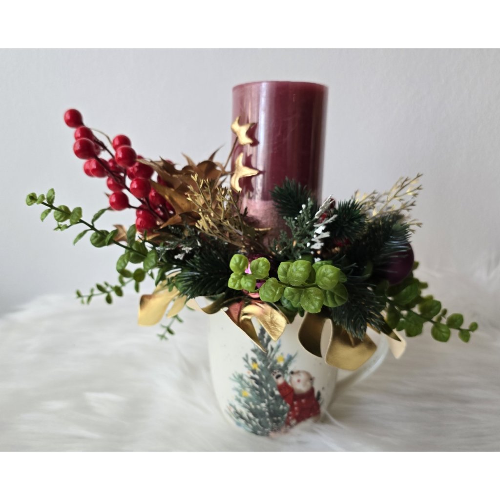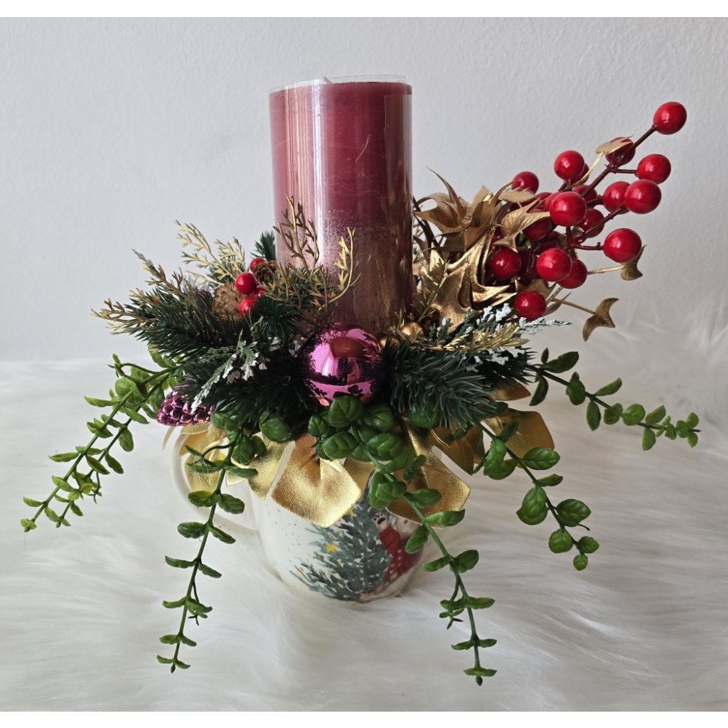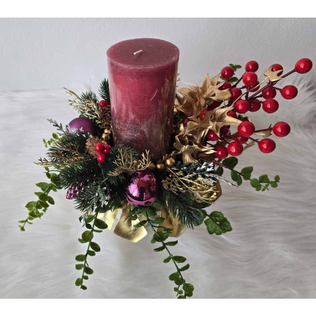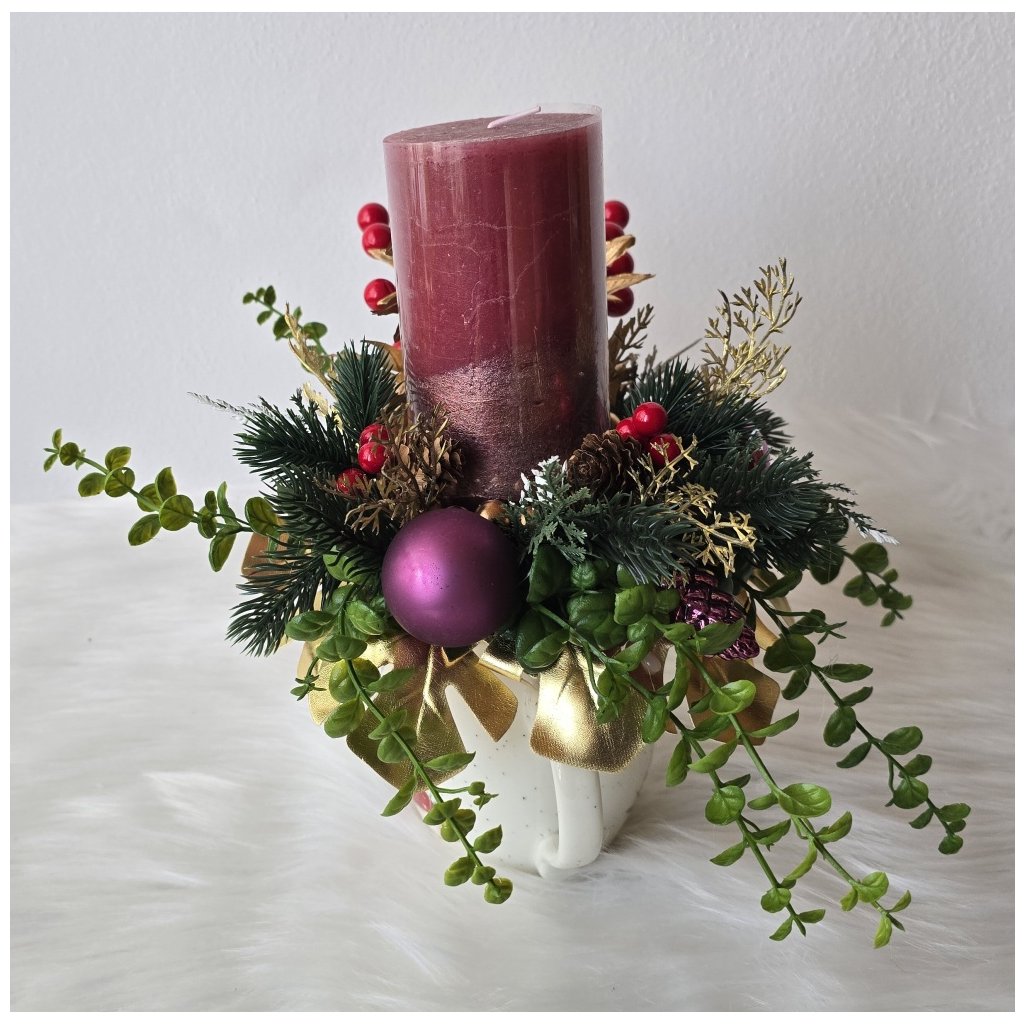 Stylový vánoční svícen s vínovou svíčkou, ozdobami v odstínech červené, zlaté a fialové. Doplňují jej zelené větvičky, šišky a elegantní stuha. Ideální dekorace pro vánoční stůl, komodu či jako dárek pro milovníky vánoční atmosféry.