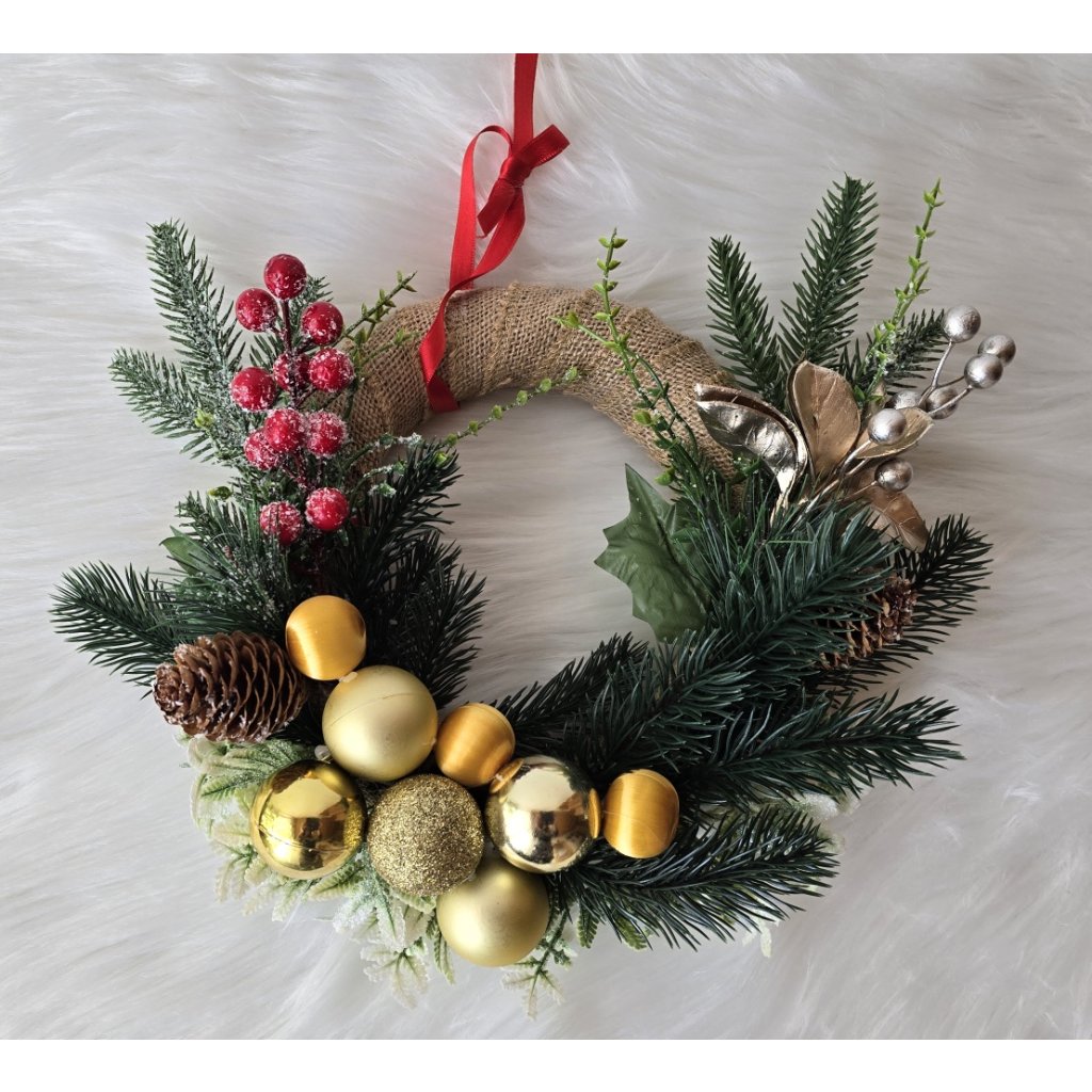 Stylový vánoční věnec laděný do zlatých, zelených a červených tónů. Kombinuje ozdoby, větvičky jehličí, šišky a bobule s elegantní mašlí. Ideální dekorace na dveře nebo zeď, která přinese do vašeho domova slavnostní a přírodní atmosféru. Ručně aranžováno pro originální vzhled.