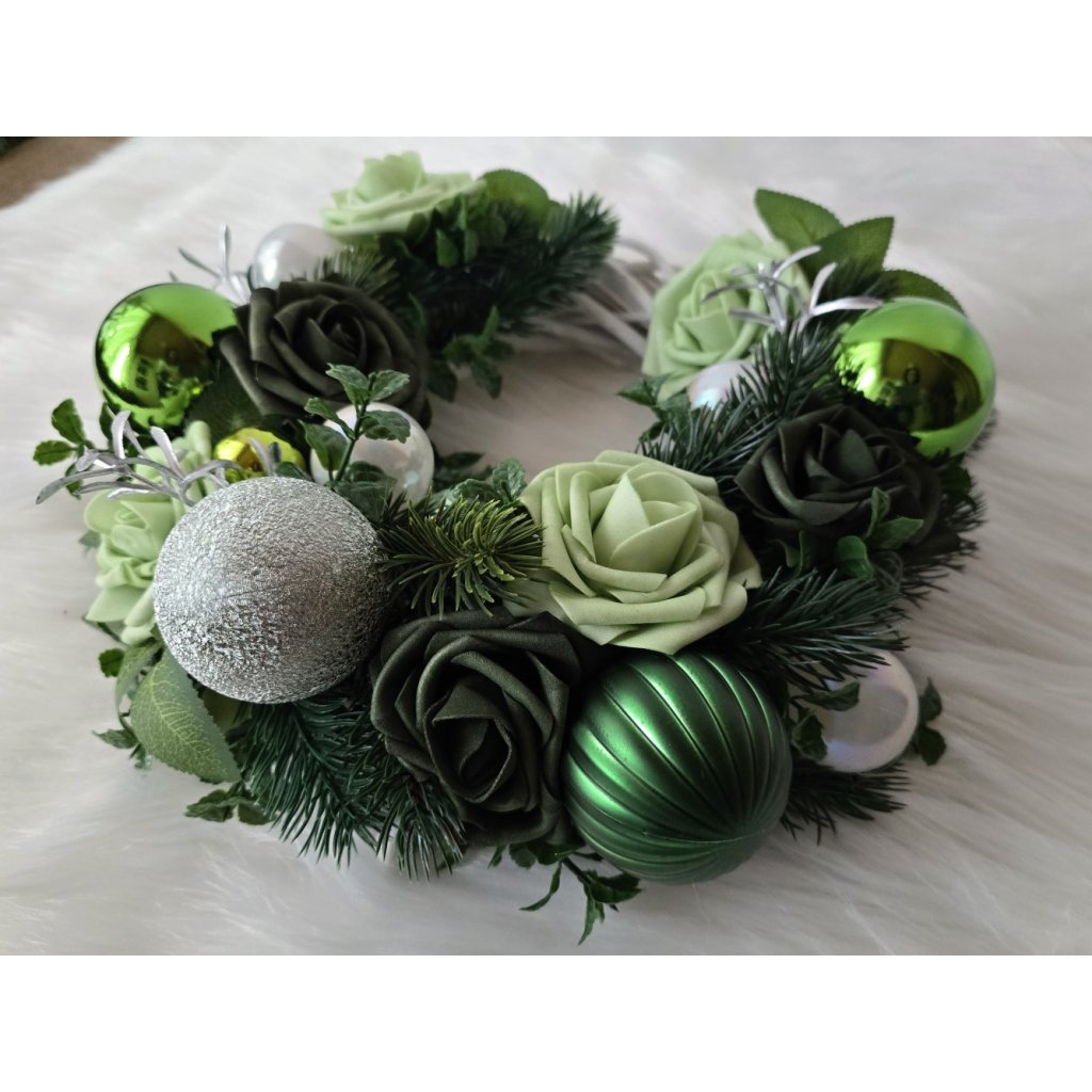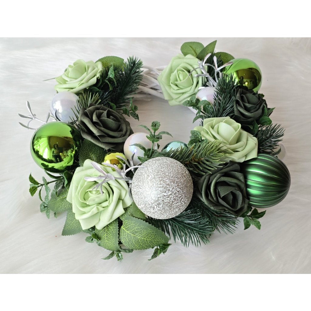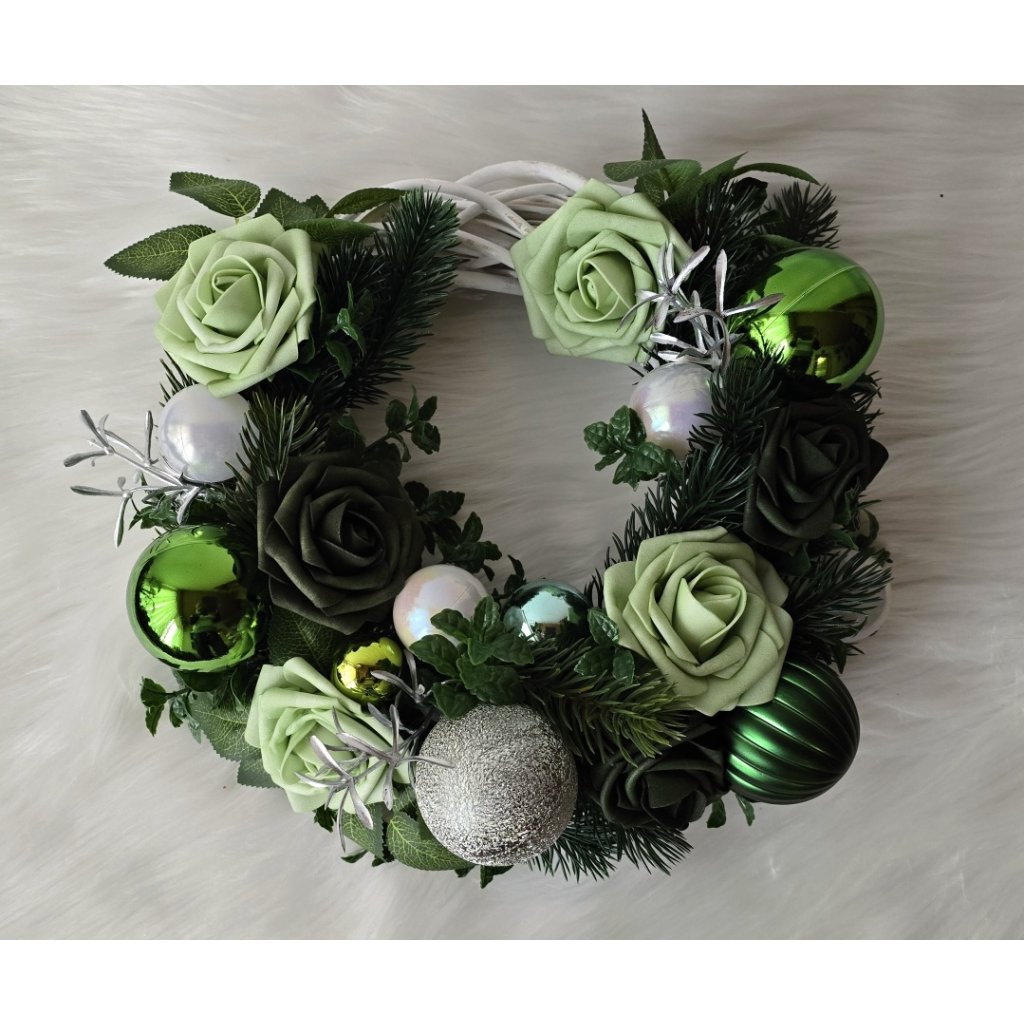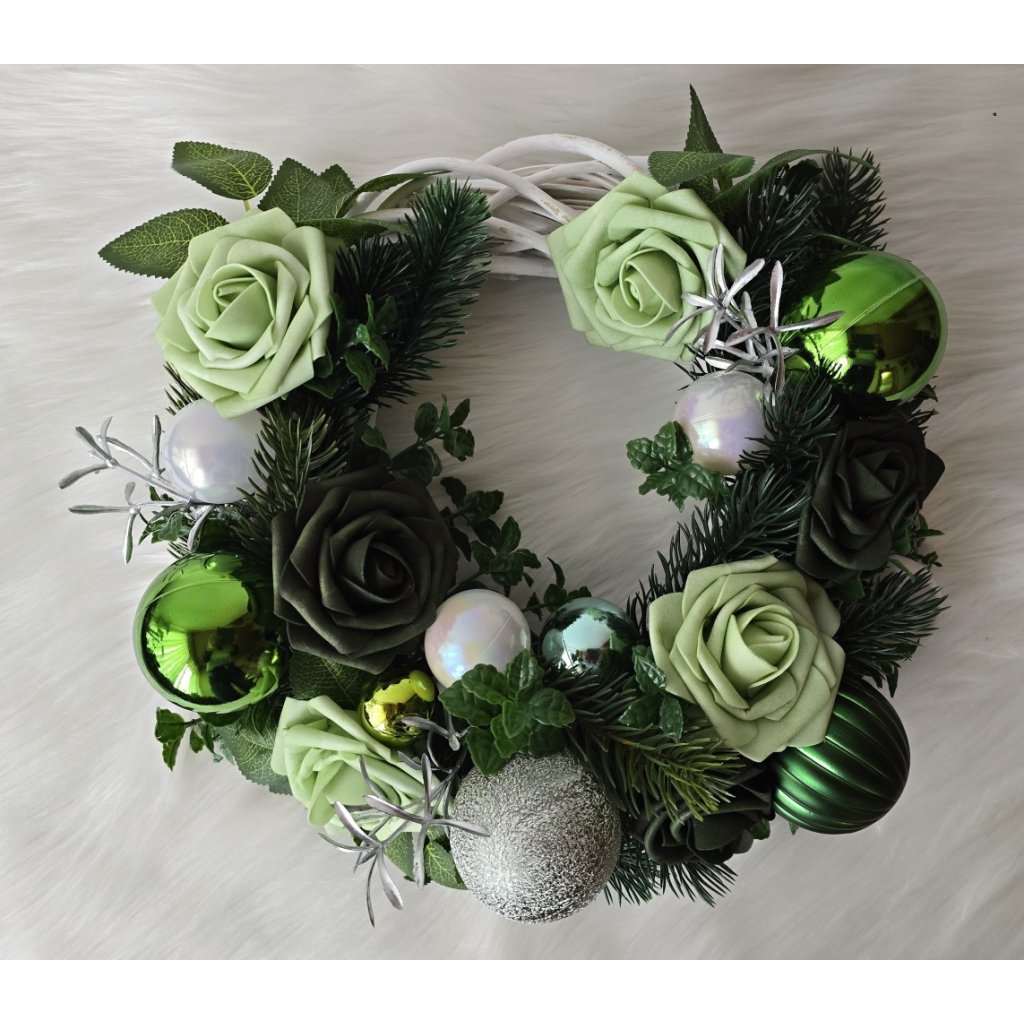 Elegantní vánoční věnec v odstínech zelené se stylovými růžemi, kouličkami a zimní výzdobou. Kombinace svěží zelené, stříbrné a bílé barvy působí moderně i přírodně. Skvělý doplněk pro vánoční dveře, stůl nebo okno. Ručně vyráběná dekorace, která vnese do vašeho domova harmonii a sváteční klid.